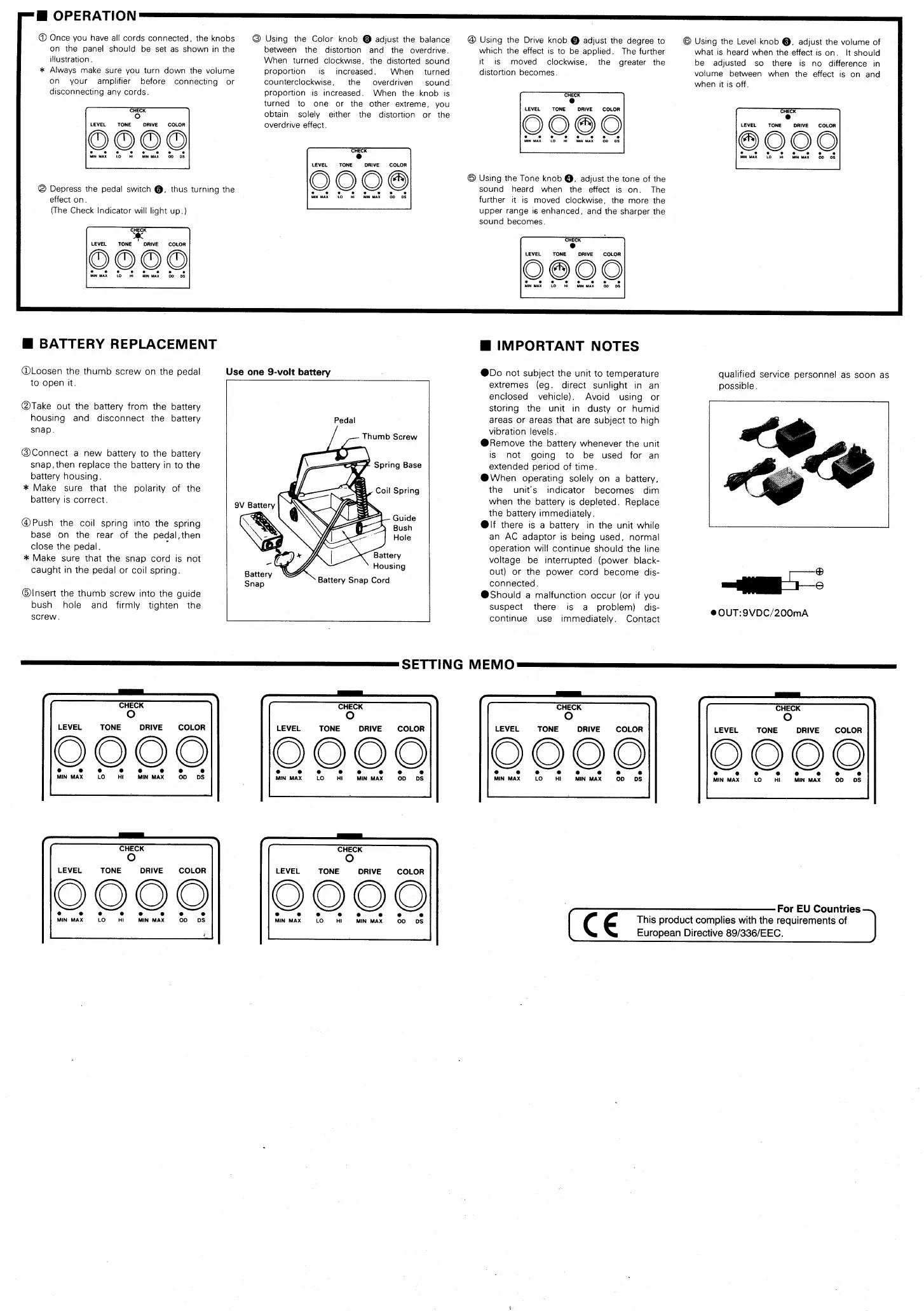 Boss OS-2 - Operation Guide; Color Knob Operation; Drive Knob Operation; Level Knob Operation
