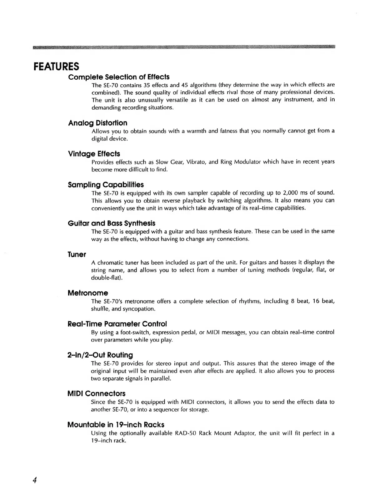 Boss PRO SE-70 - FEATURES; Complete Selection of Effects; Analog Distortion; Vintage Effects
