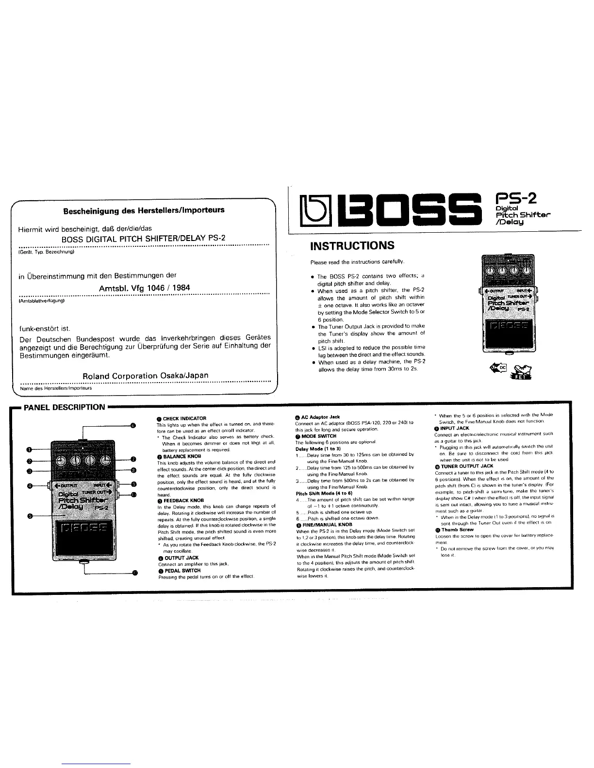 Boss PS-2 - BOSS PS-2 Panel Description; CHECK INDICATOR; BALANCE KNOB; FEEDBACK KNOB