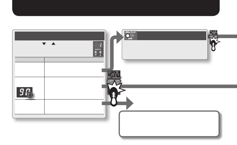 Para gravação, overdubbing e reprodução, pressione o pedal como mostra o diagrama.