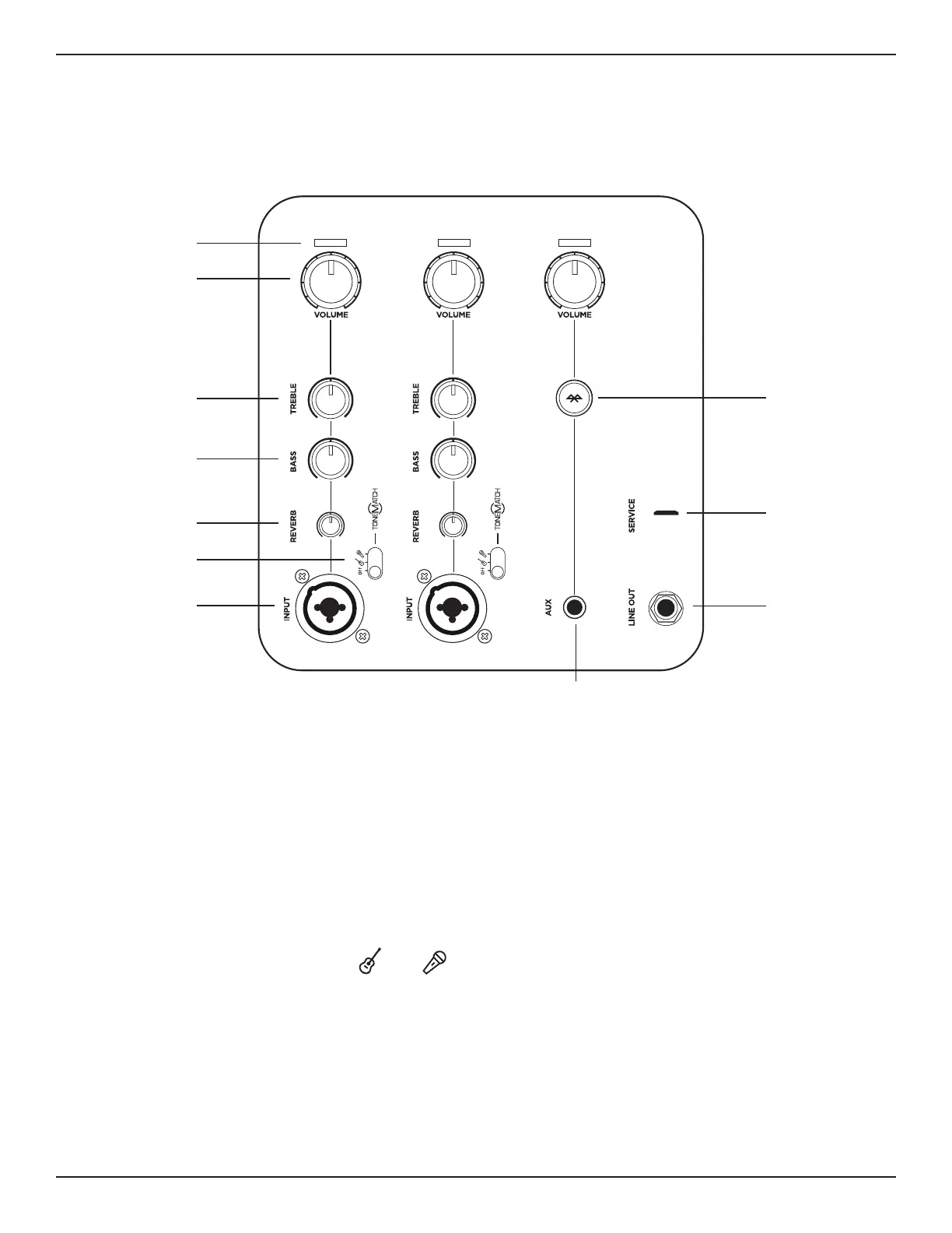 b Hangerőszabályzó: Ezzel állíthatja be a mikrofon, a hangszere vagy az egyéb hangforrás hangerejét.
