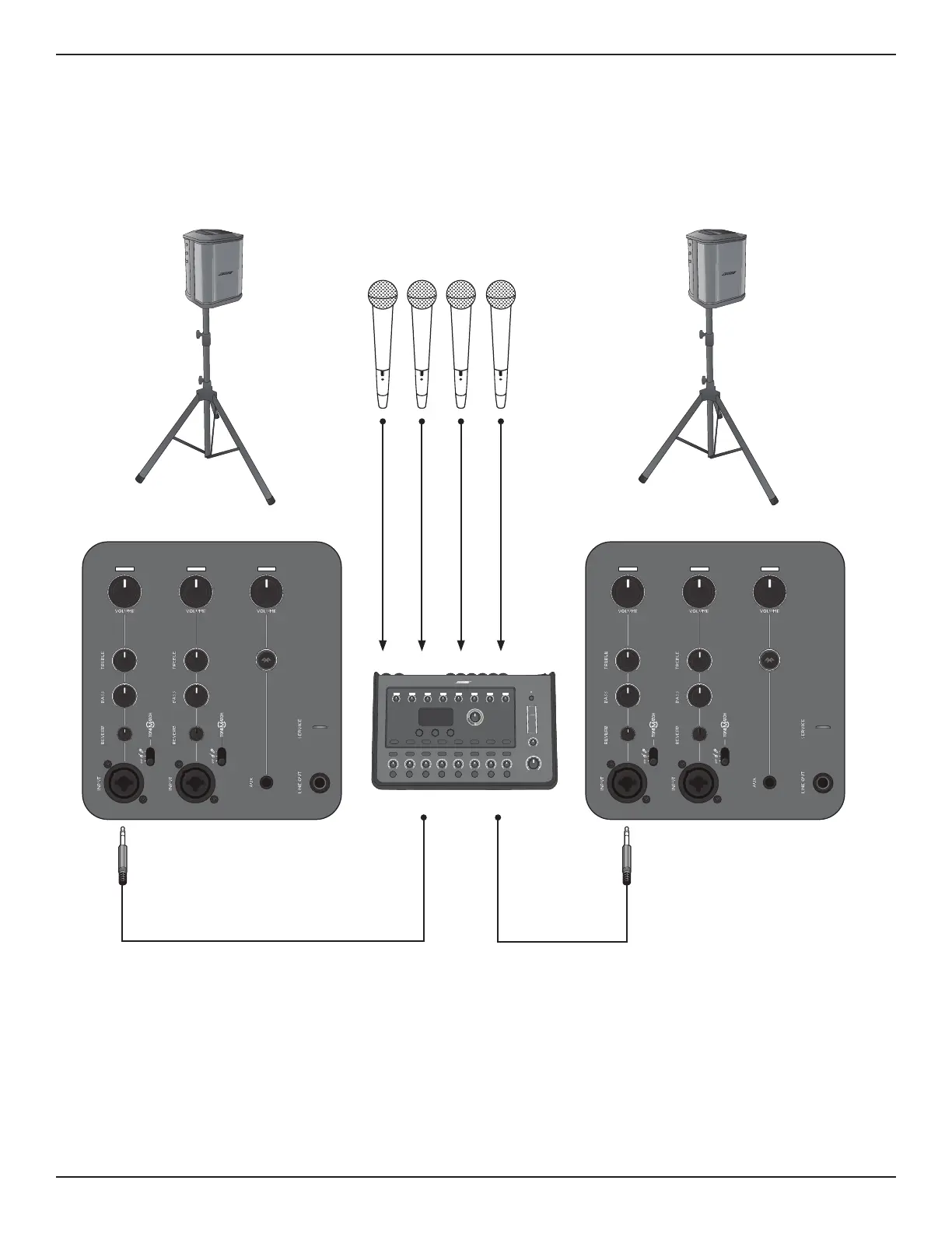 Gebruik een mixer met twee S1 Pro systems als conventioneel PA-systeem. Door de brede, consistente