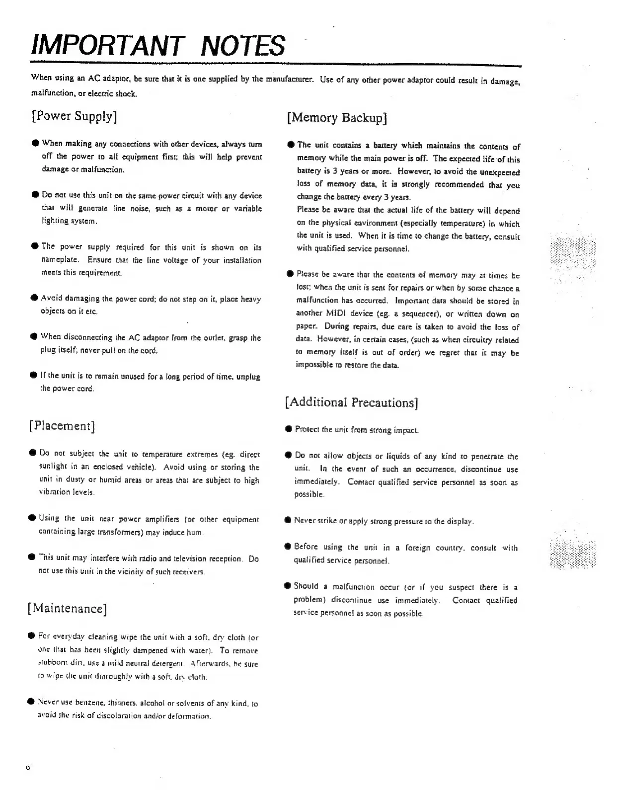 Boss SE-50 - Important Notes and Precautions; Power, Placement, and Maintenance; Memory Backup and Safety