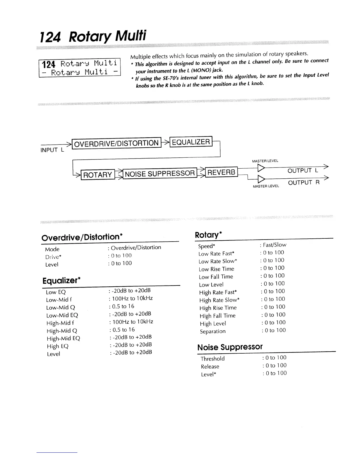 Boss SE-70 - 124 Rotary Multi Algorithm; Rotary Multi Overdrive;Distortion Parameters; Rotary Multi Rotary Parameters; Rotary Multi Noise Suppressor Parameters