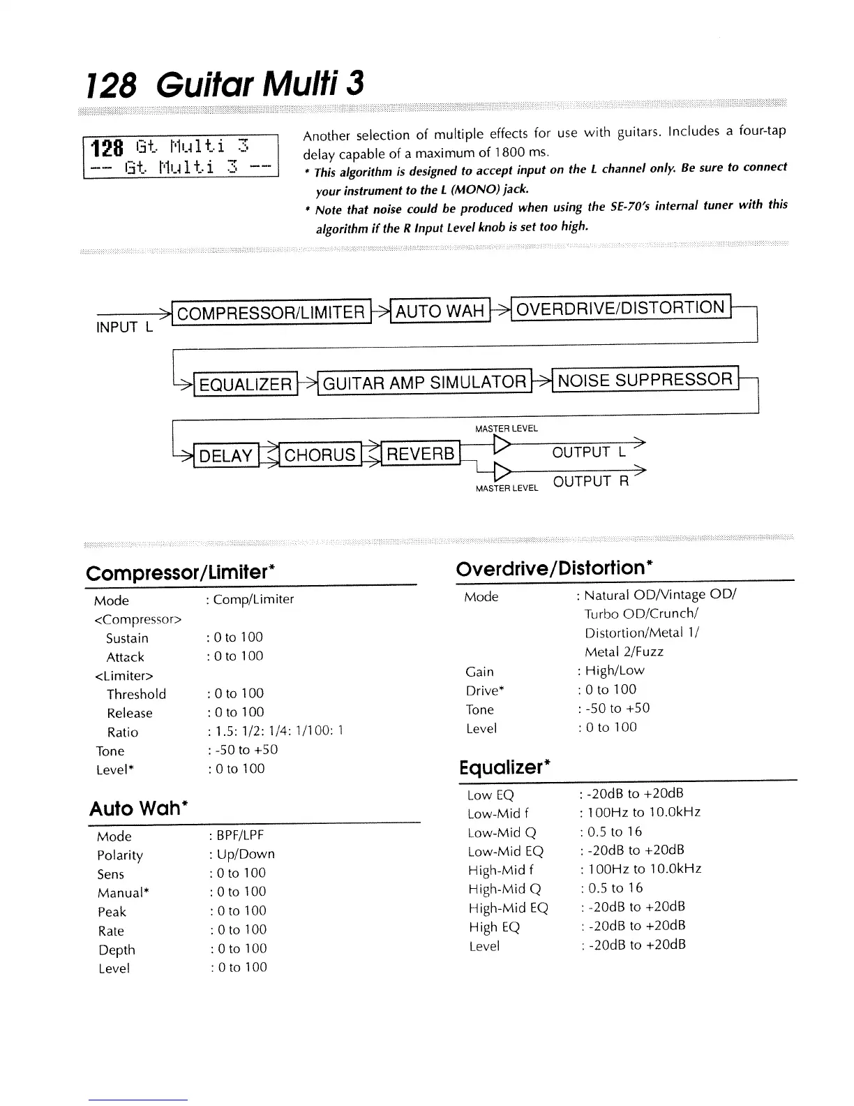 Boss SE-70 - 128 Guitar Multi 3 Algorithm; Guitar Multi 3 Compressor;Limiter Parameters; Guitar Multi 3 Auto Wah Parameters; Guitar Multi 3 Overdrive;Distortion Parameters