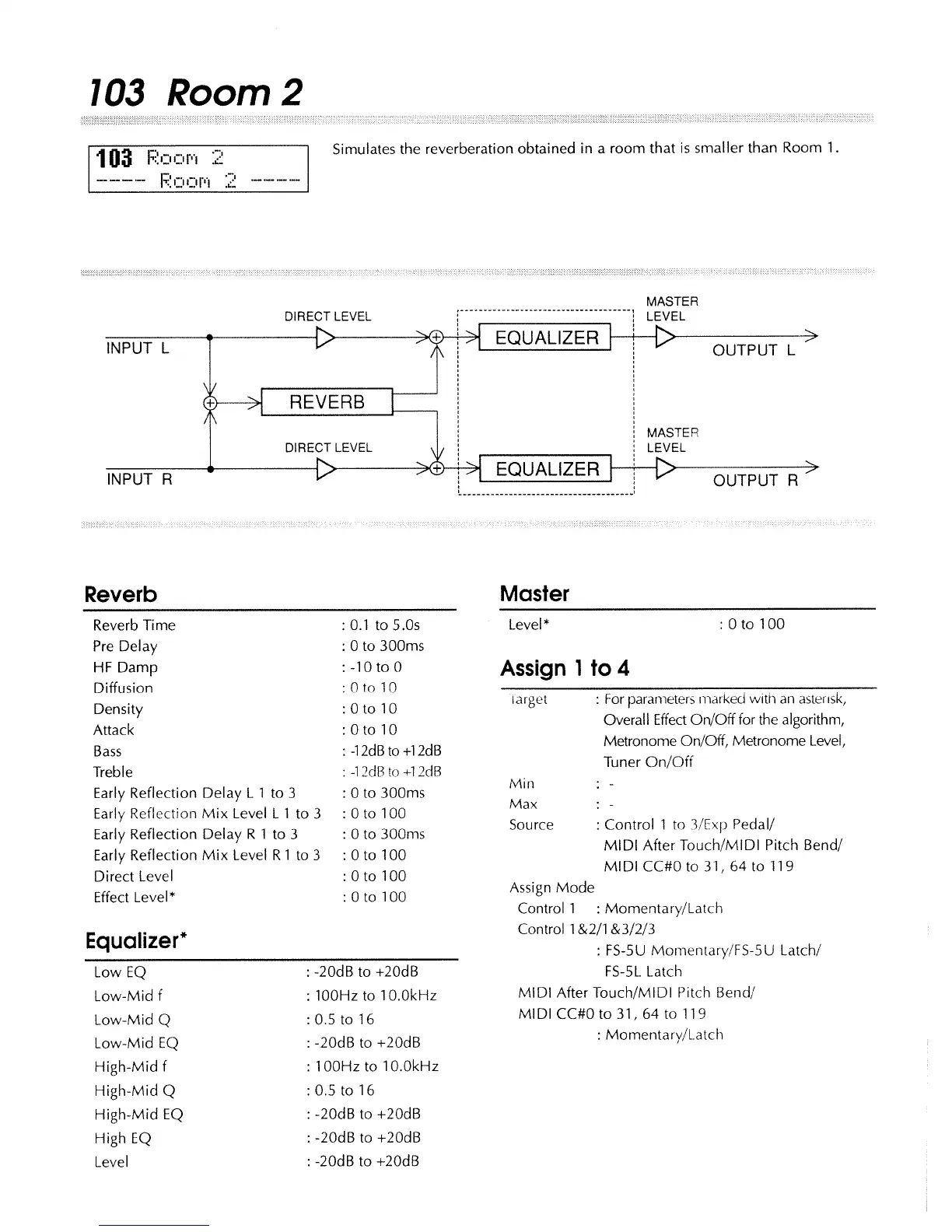 Boss SE-70 - 103 Room 2 Algorithm; Room 2 Reverb Parameters; Room 2 Equalizer Settings; Room 2 Master Level