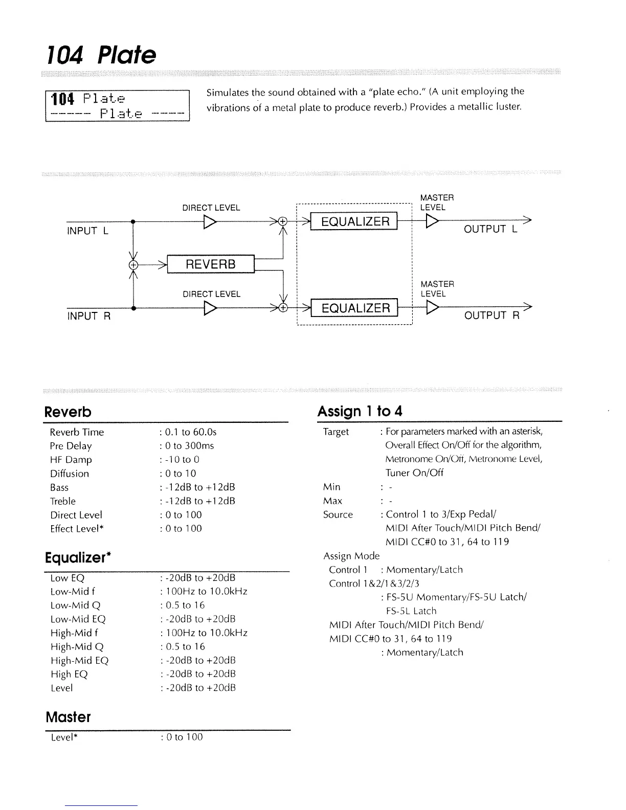 Boss SE-70 - 104 Plate Algorithm; Plate Reverb Parameters; Plate Equalizer Settings; Plate Master Level