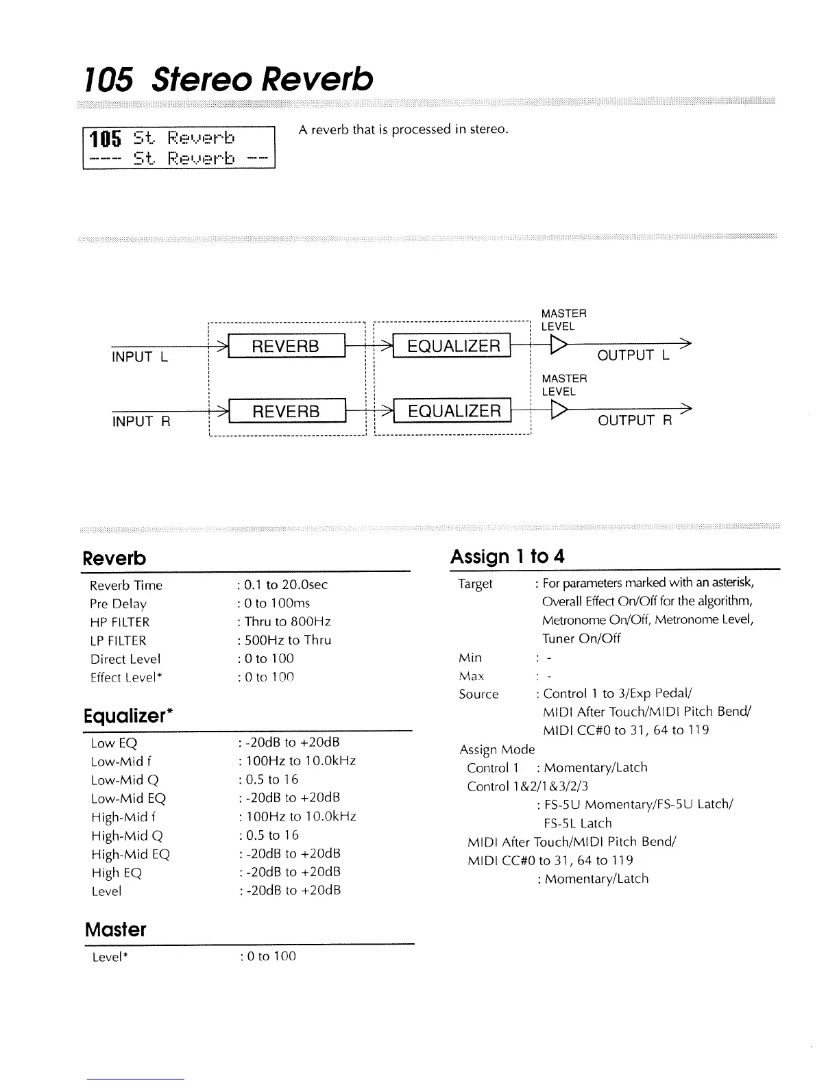 Boss SE-70 - 105 Stereo Reverb Algorithm; Stereo Reverb Parameters; Stereo Reverb Equalizer Settings; Stereo Reverb Master Level
