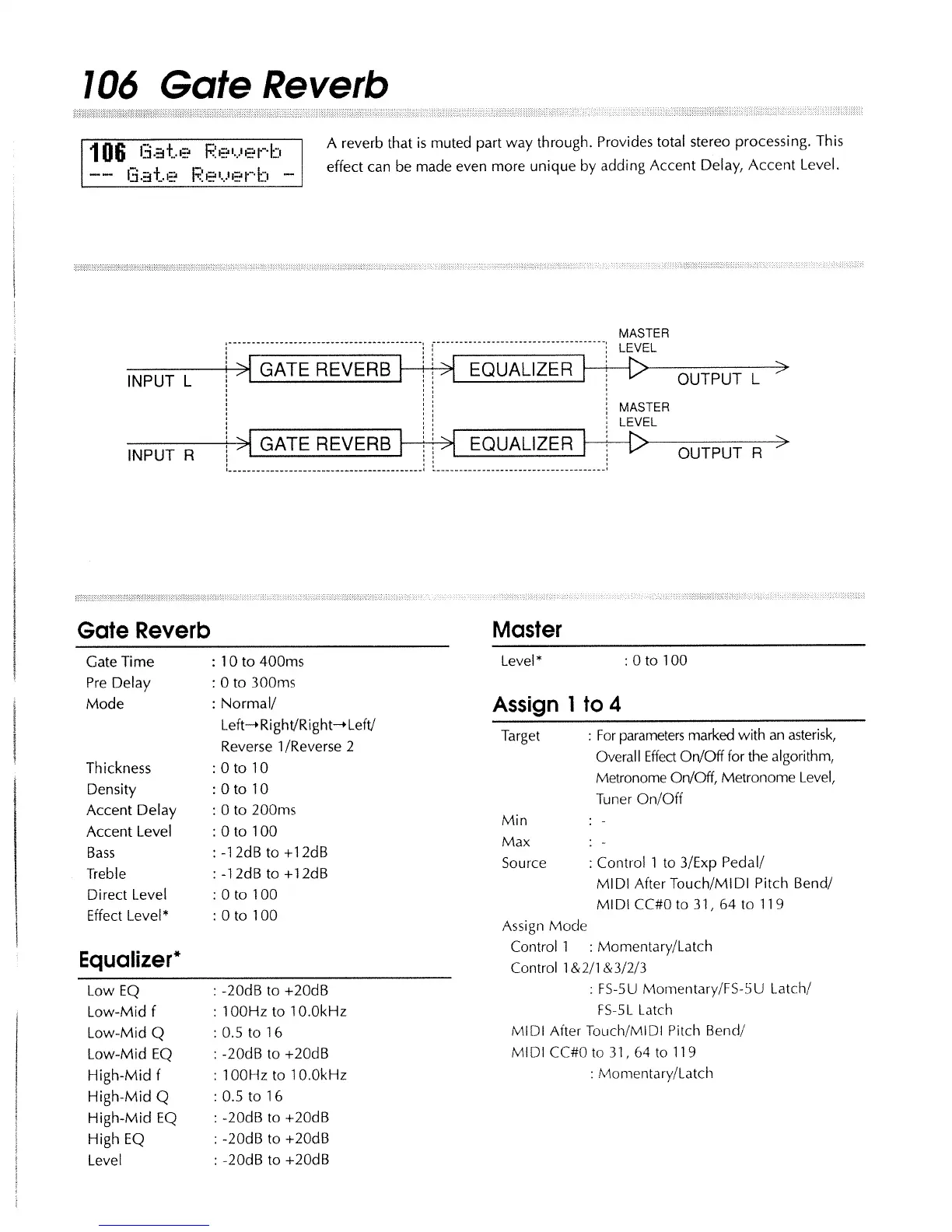 Boss SE-70 - 106 Gate Reverb Algorithm; Gate Reverb Parameters; Gate Reverb Equalizer Settings; Gate Reverb Master Level