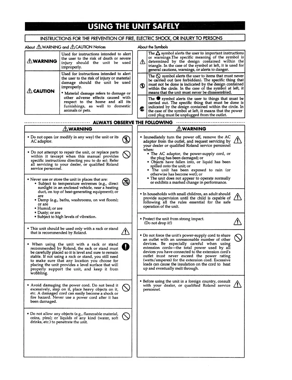 Boss SX-700 - USING THE UNIT SAFELY; Safety Notices and Symbols; Essential Safety Precautions