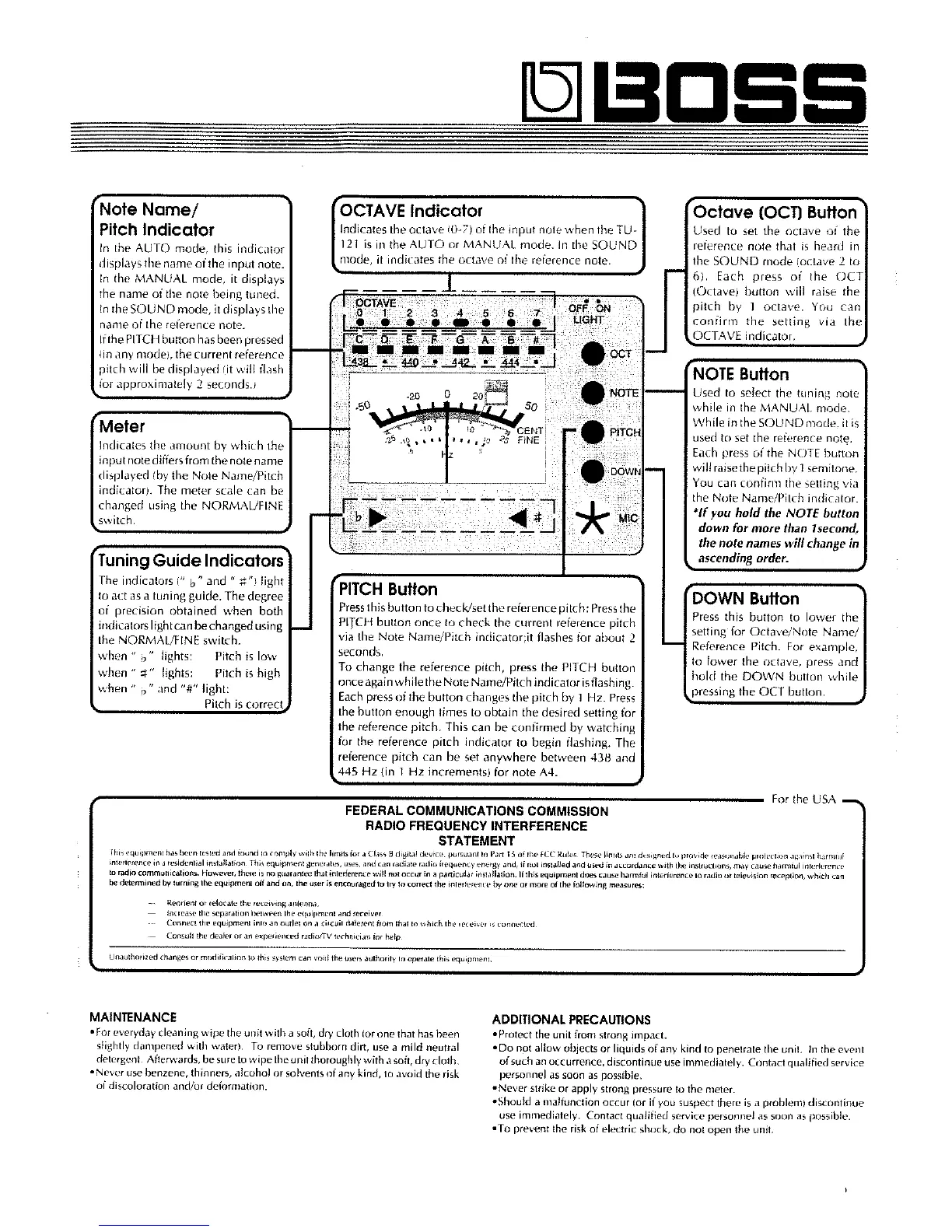 Boss TU-121 - Controls and Indicators Explained; Tuning Indicators and Displays; Tuning Adjustment Buttons; Regulatory and Maintenance Information