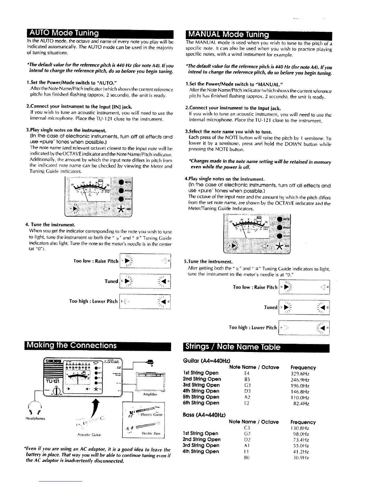 Boss TU-121 - Tuning Modes and Operations; AUTO Mode Tuning Guide; MANUAL Mode Tuning Guide; Connections and Reference Data