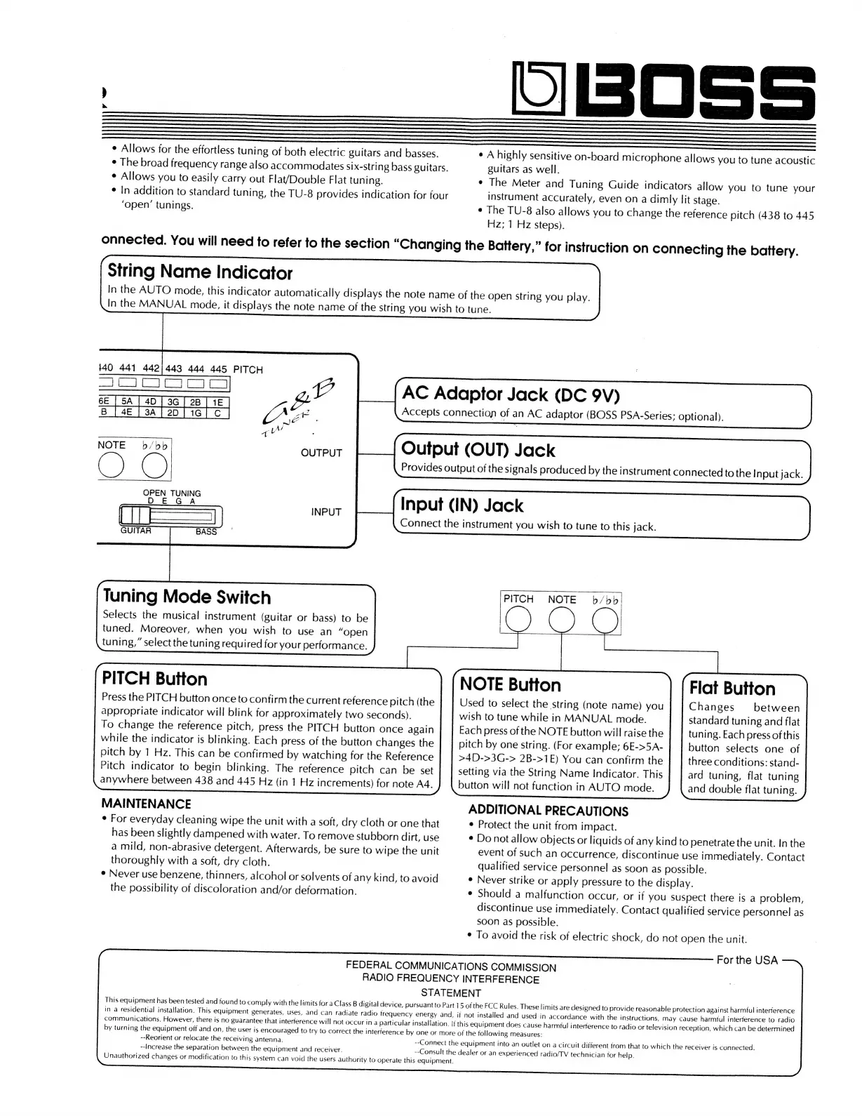 Boss TU-8 - Control Elements and Indicators; String Name Indicator; Tuning Mode Selection; Pitch Adjustment Button
