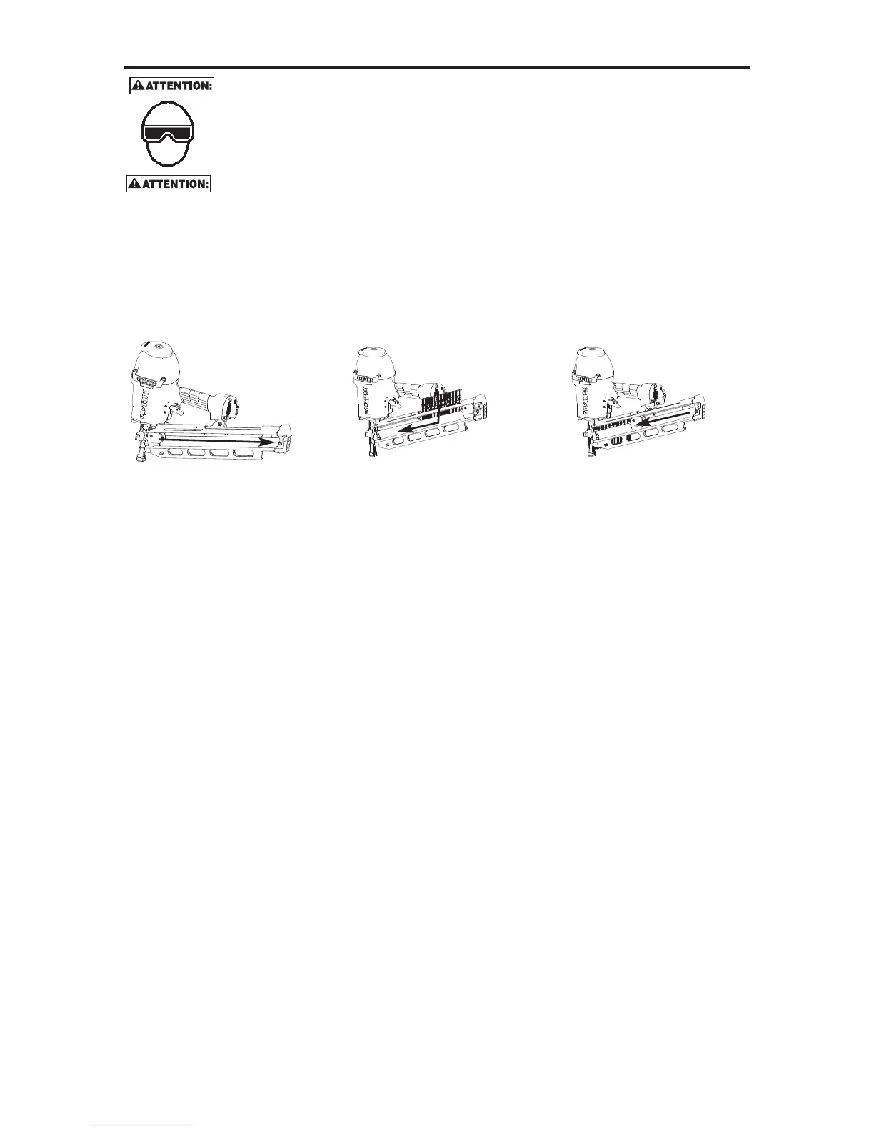• N’appuyez jamais sur la gâchette ni n’abaissez le mécanisme de butée en chargeant l’outil.