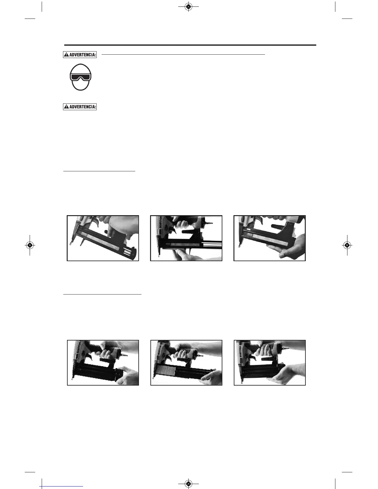 • Nunca coloque la mano ni ninguna parte del cuerpo en el área de descarga de clavos de