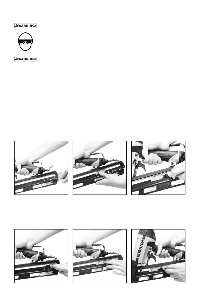 • Do not pull the trigger or depress the trip mechanism while loading the tool.