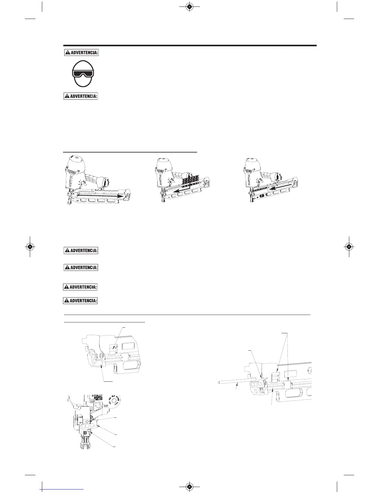 • Nunca coloque la mano ni ninguna parte del cuerpo en el área de descarga de clavos de la herramienta mientras