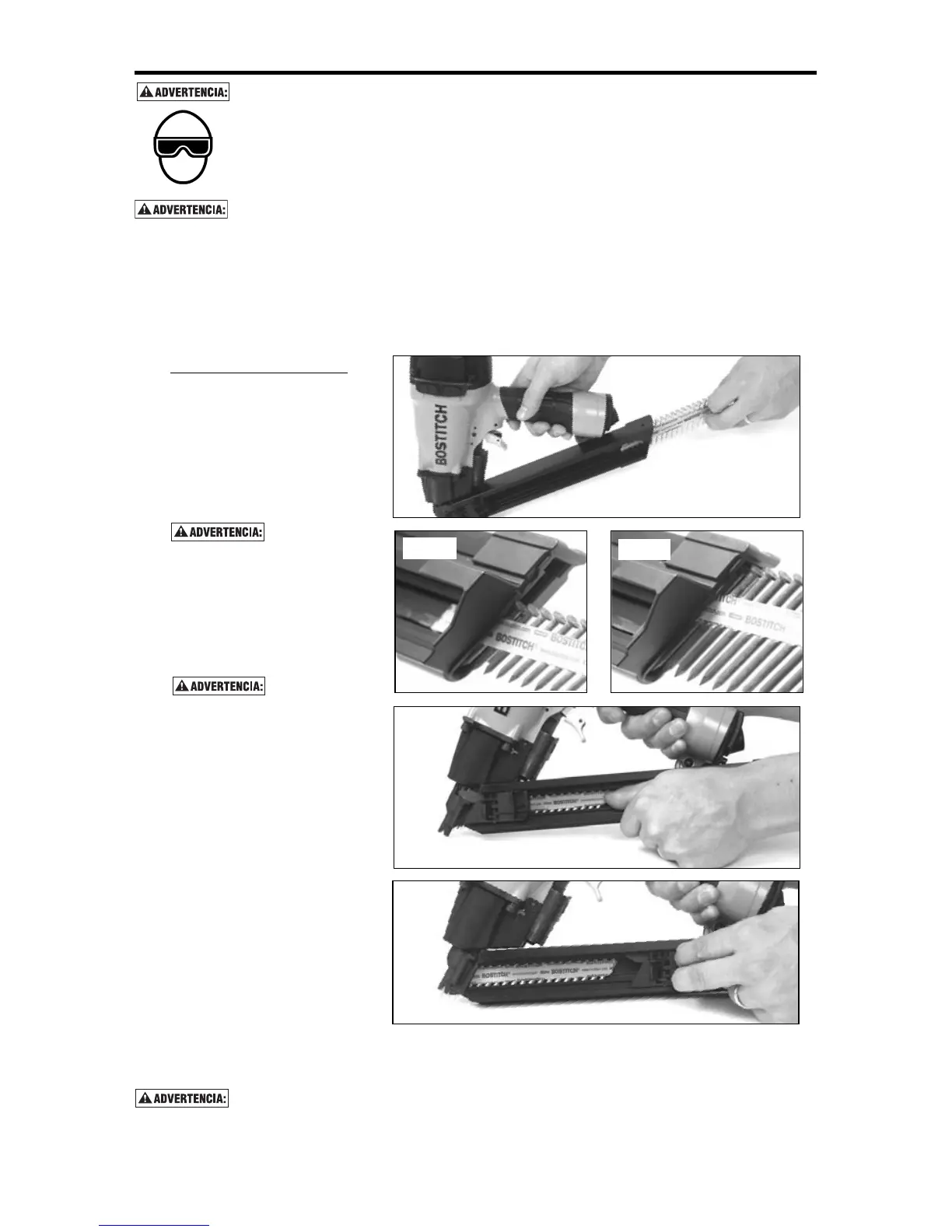 • Nunca coloque la mano ni ninguna parte del cuerpo en el área de descarga de clavos de la herramienta mientras
