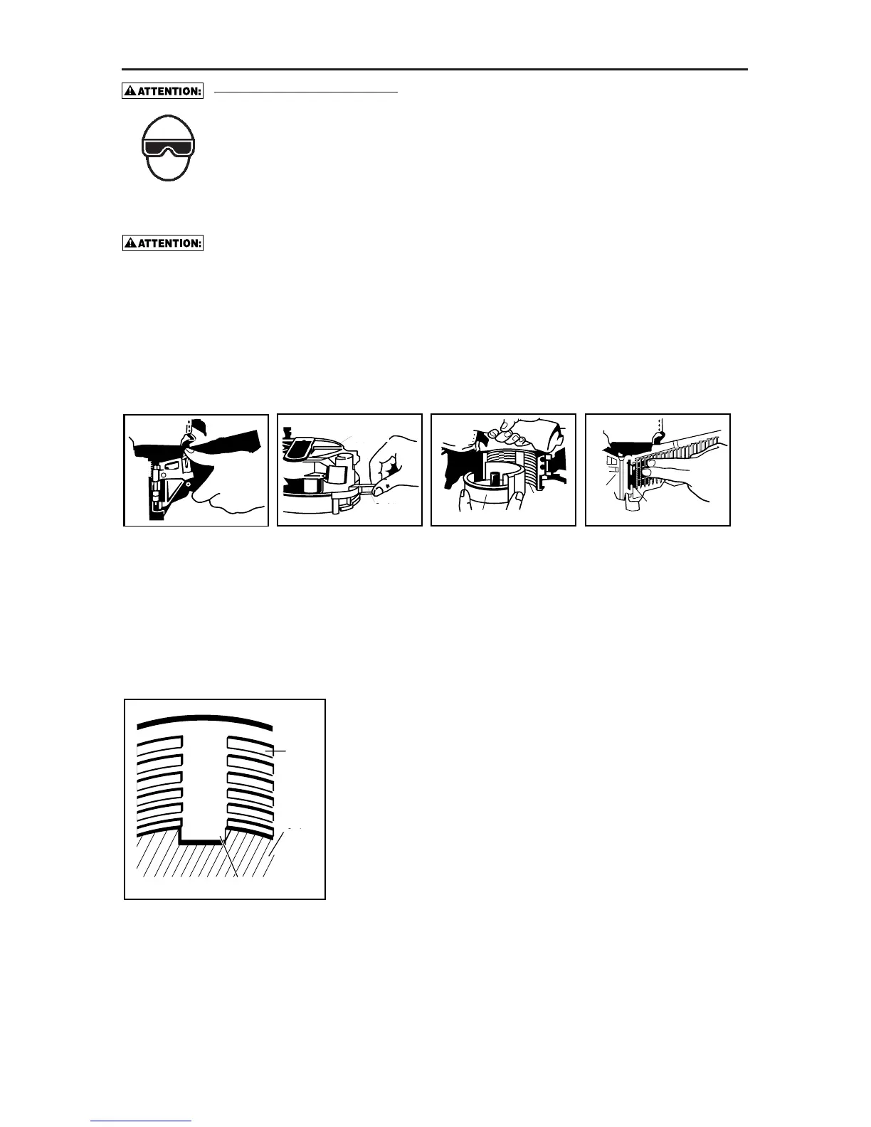 2) Vérification du réglage : le cloueur doit être réglé pour la longueur de clou utilisée. L’alimentation