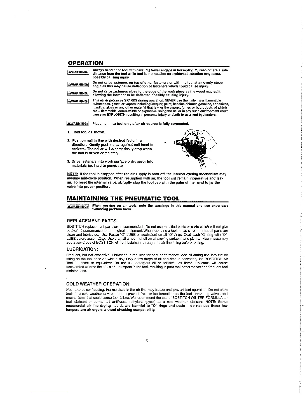 Bostitch PN50 - Operation; General Handling and Safety; Fastener Driving Precautions; Flammable Environment Warning