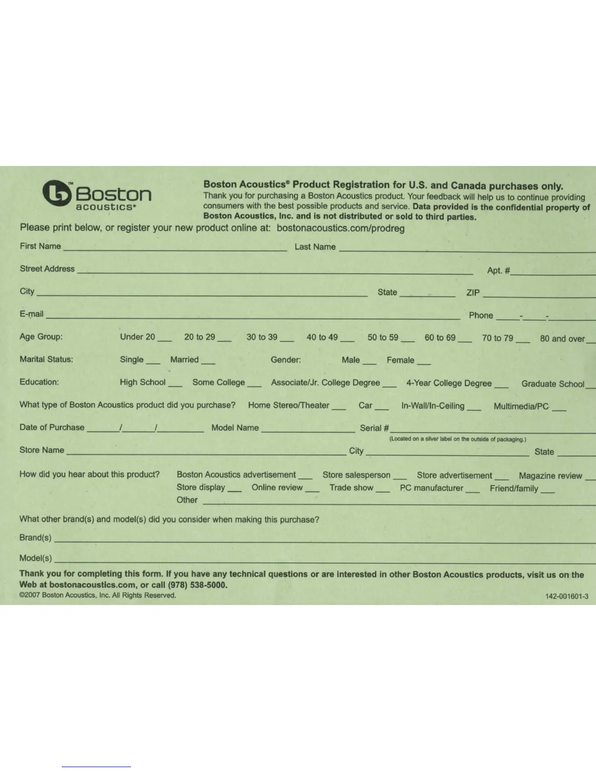 Thank you for purchasing a Boston Acoustics product. Your feedback will help us to continue providing