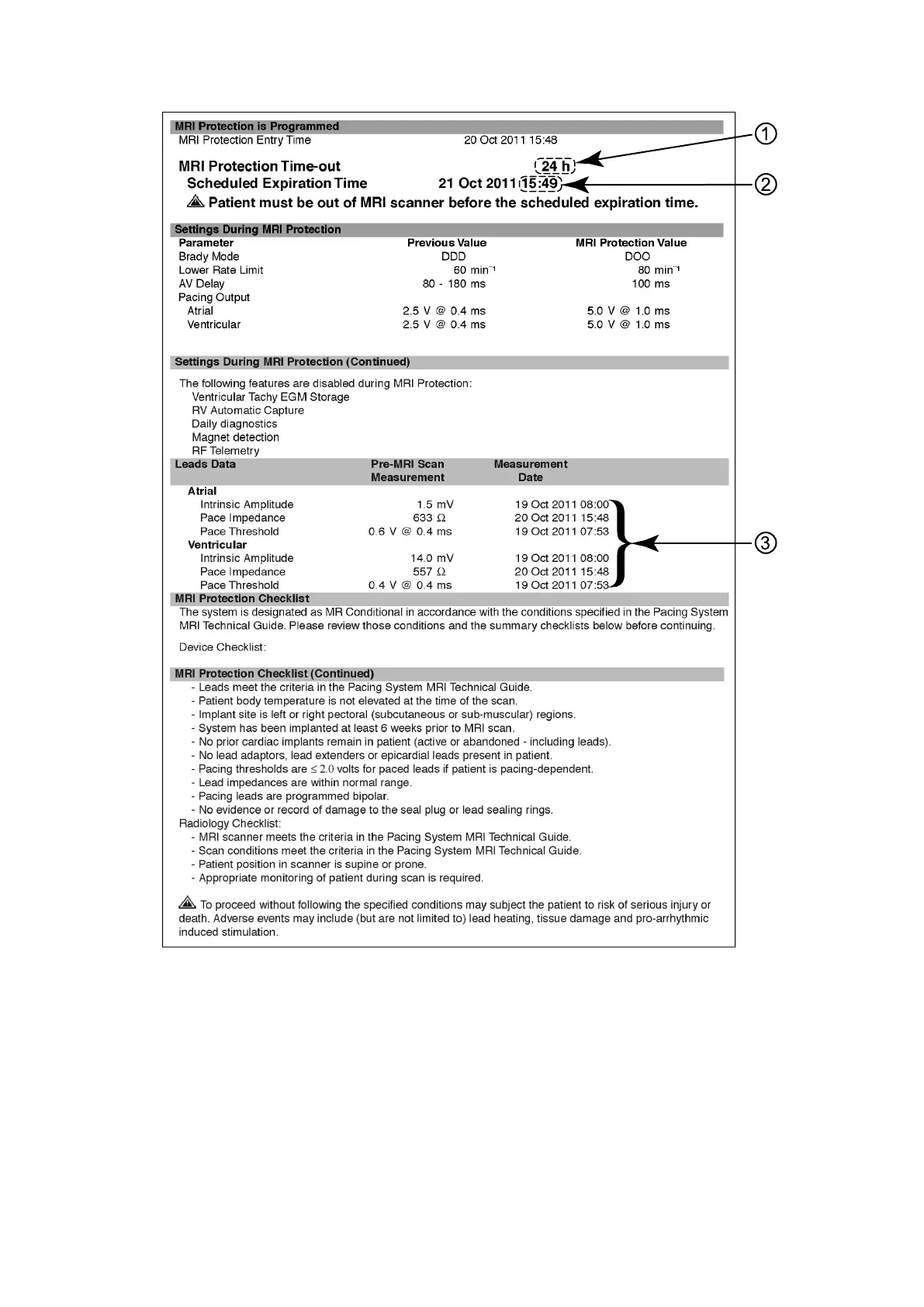 [1] If MRI Protection Time-out is displayed as “Off”, the pulse generator remains in MRI Protection Mode until manually reprogrammed; [2]