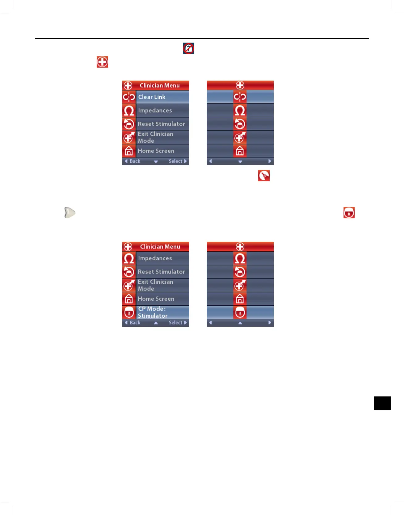 (Căutare Stimulator) este așată în Clinician Menu (Meniu medic) în loc de opțiunea Clear