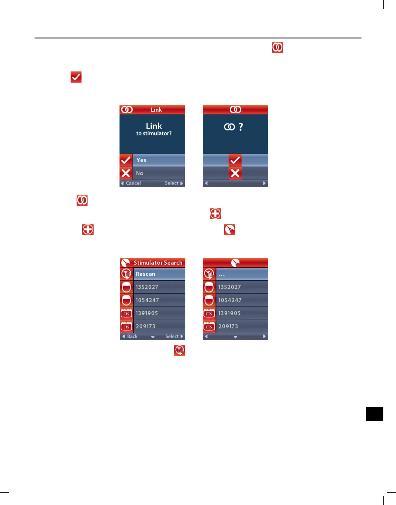 Če daljinski upravljalnik trenutno ni povezan s stimulatorjem, se lahko zaslon Link to Stimulator?