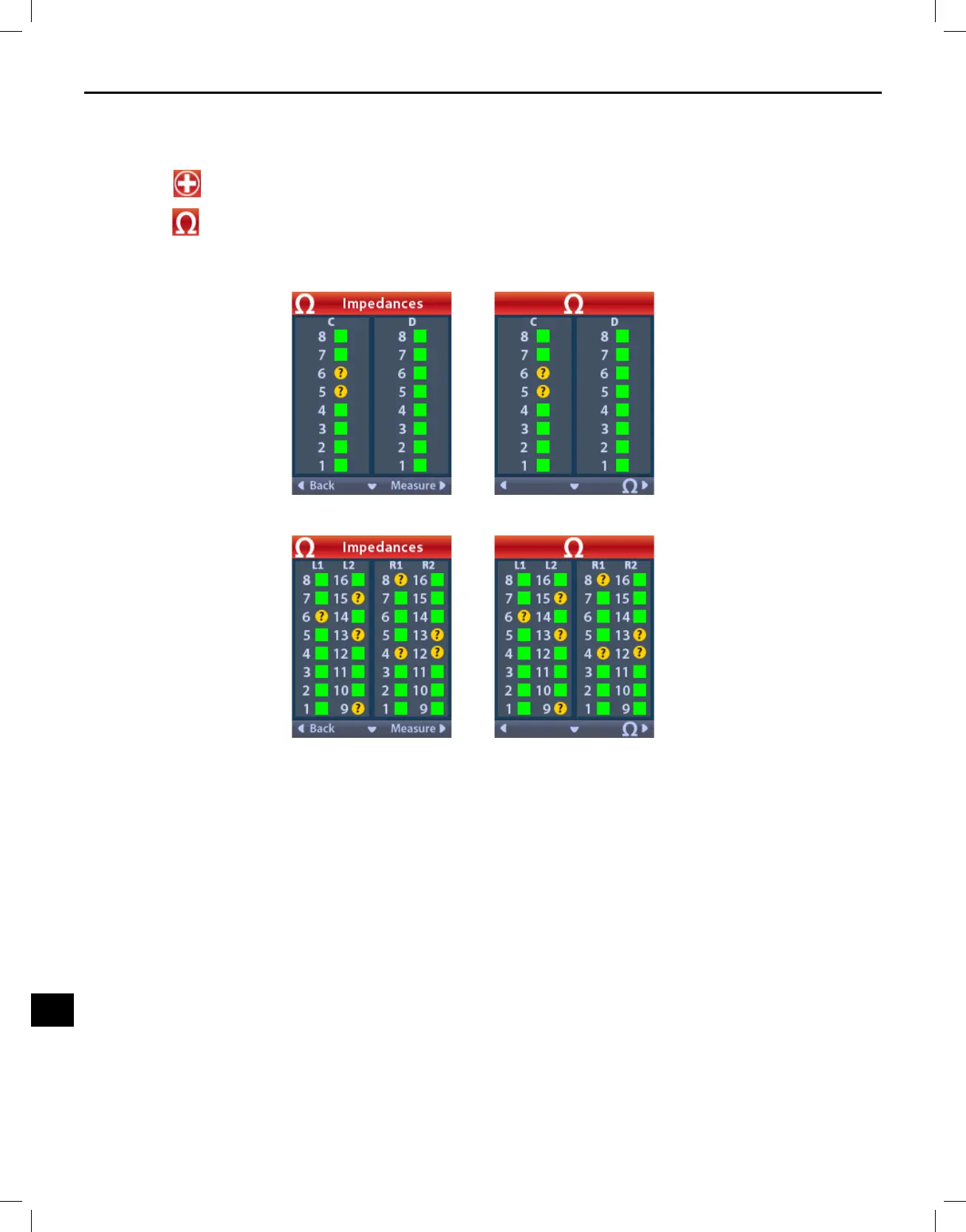 razponu. Rumena pika z vprašajem nakazuje, da vrednost impedance ni v sprejemljivem razponu