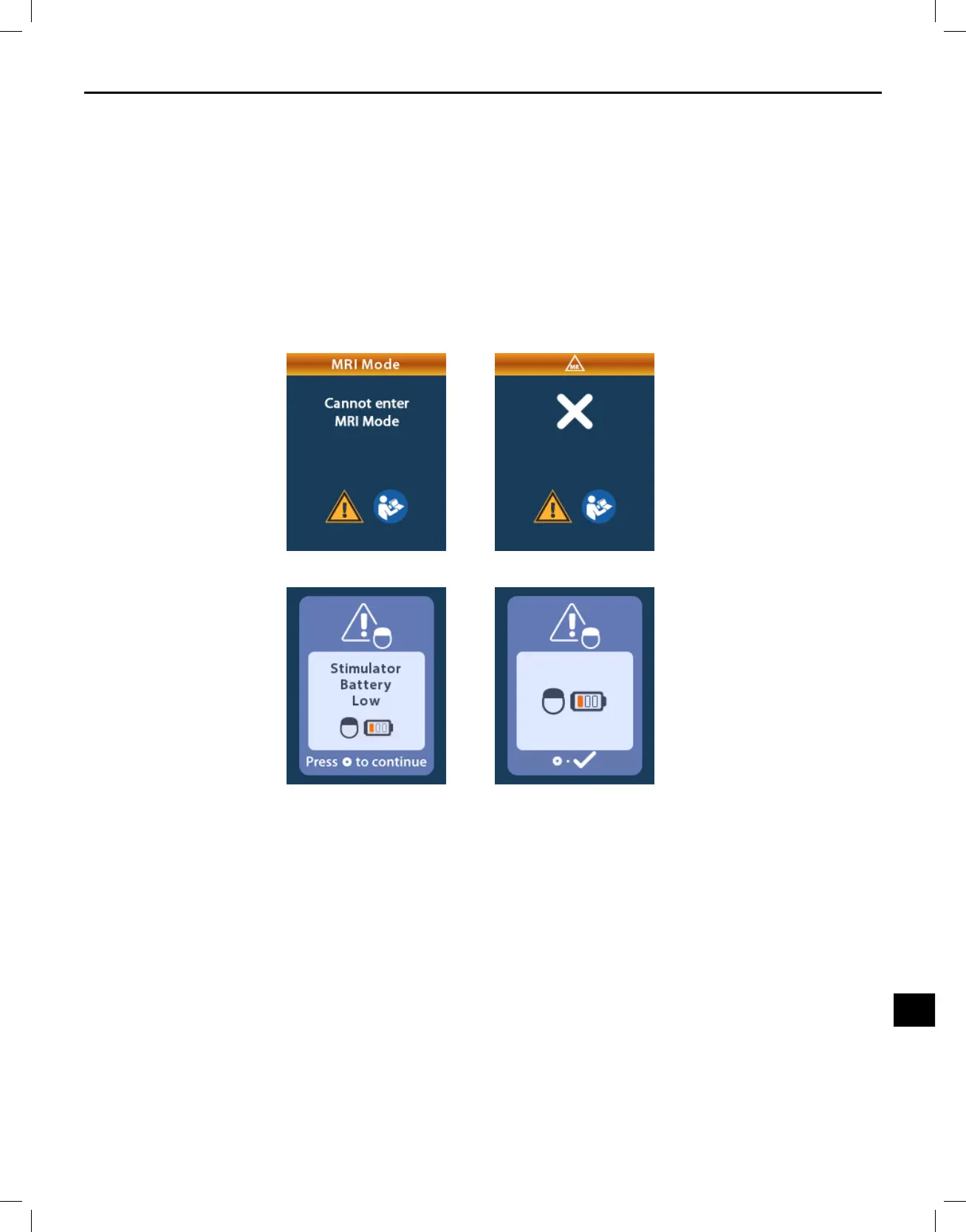 z MR ni mogoč) in nato še »Stimulator Battery Low« (Nizka raven napolnjenosti baterije stimulatorja).