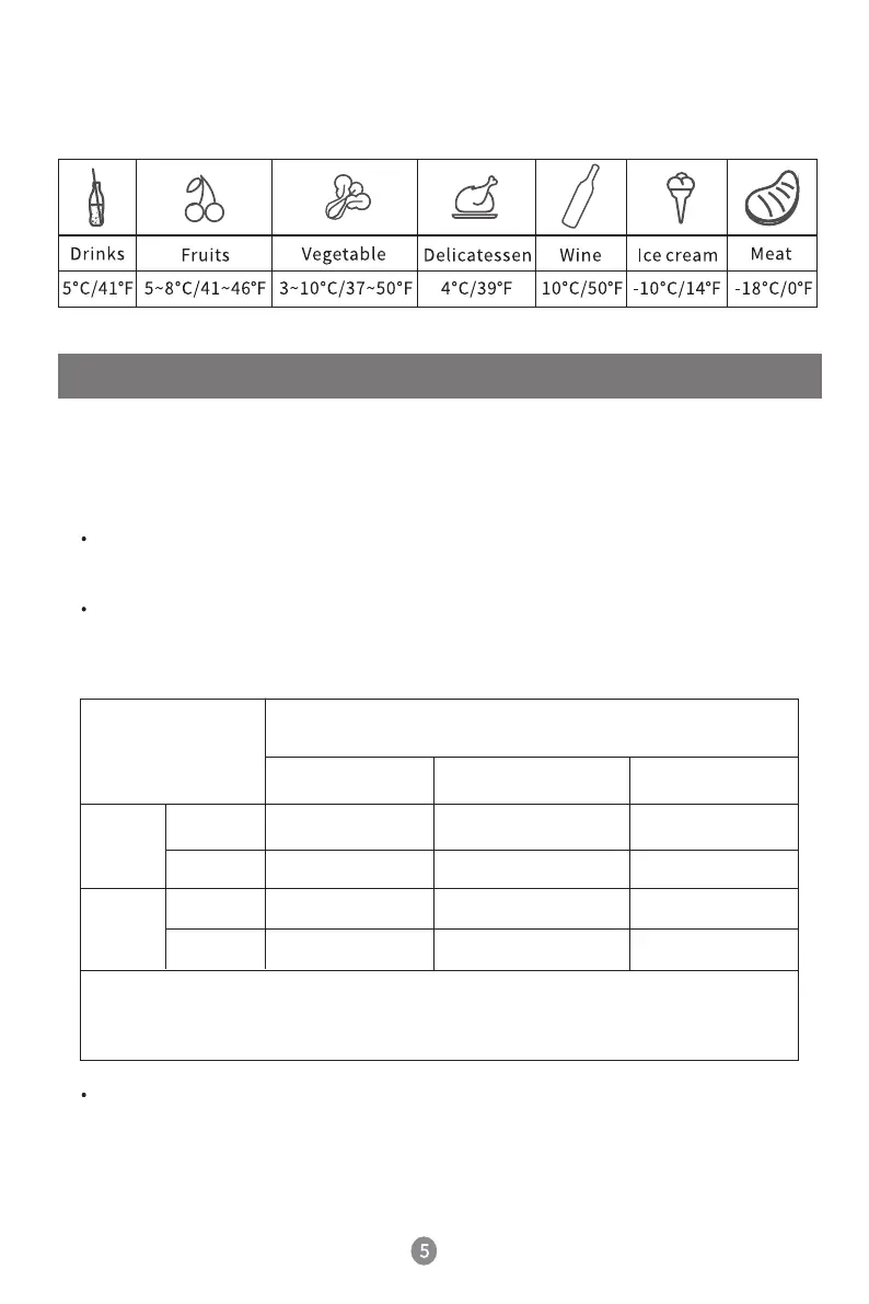 Recommended temperature for common food:
