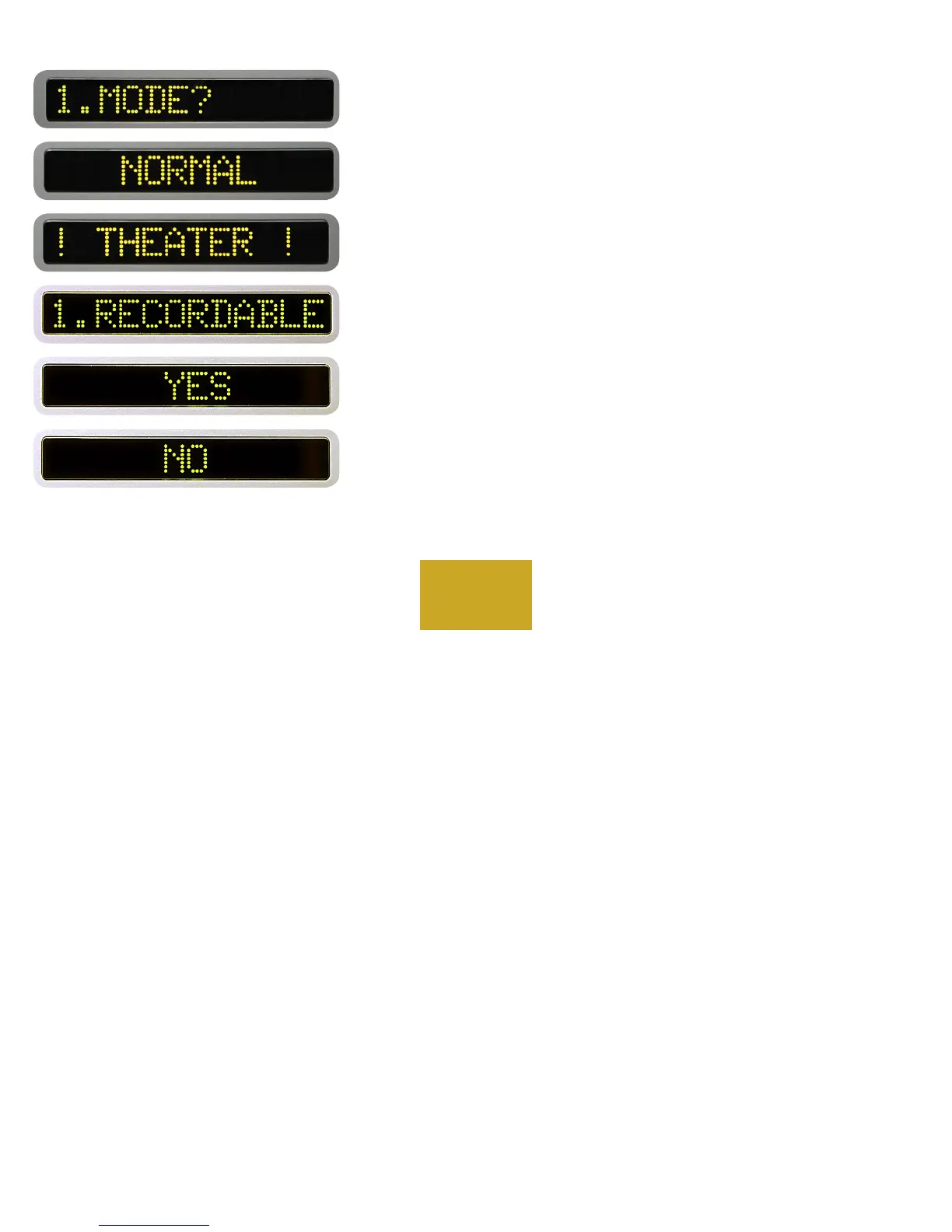 in the right display. Pressing the UP button to display “! THEATER !” and
