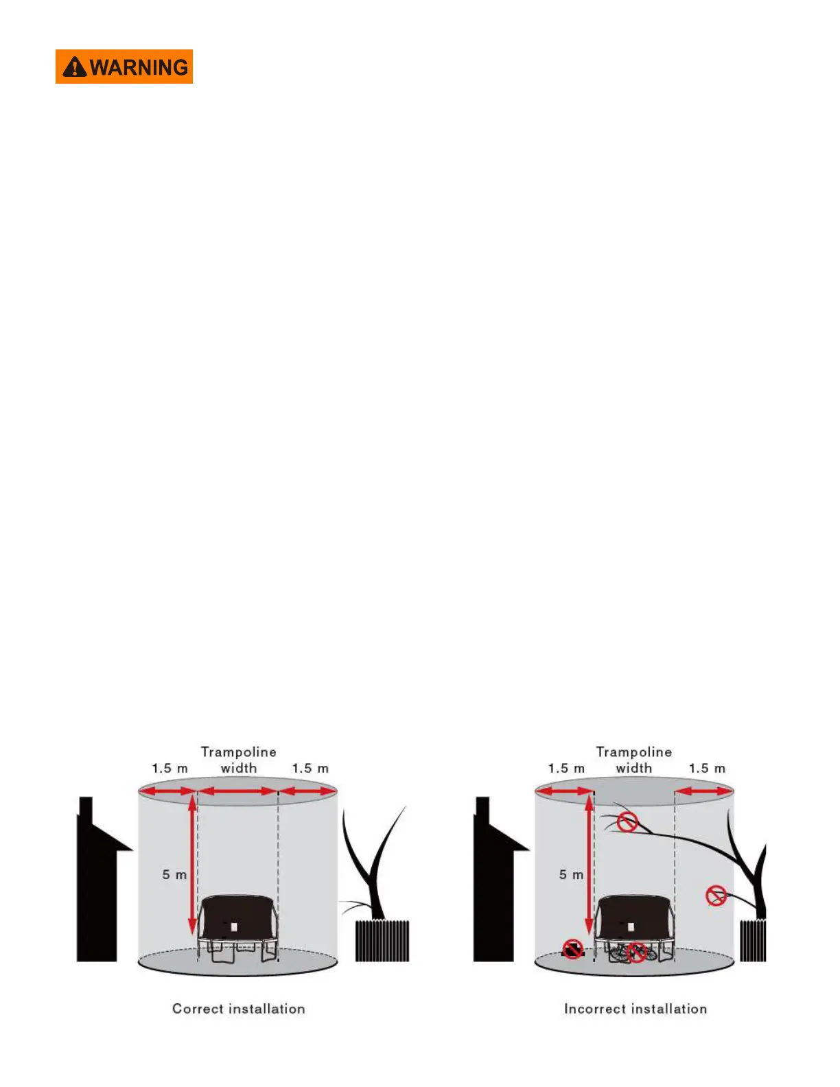 Maintain a minimum clearance of 1.5 m on all sides of the trampoline. This area should not include