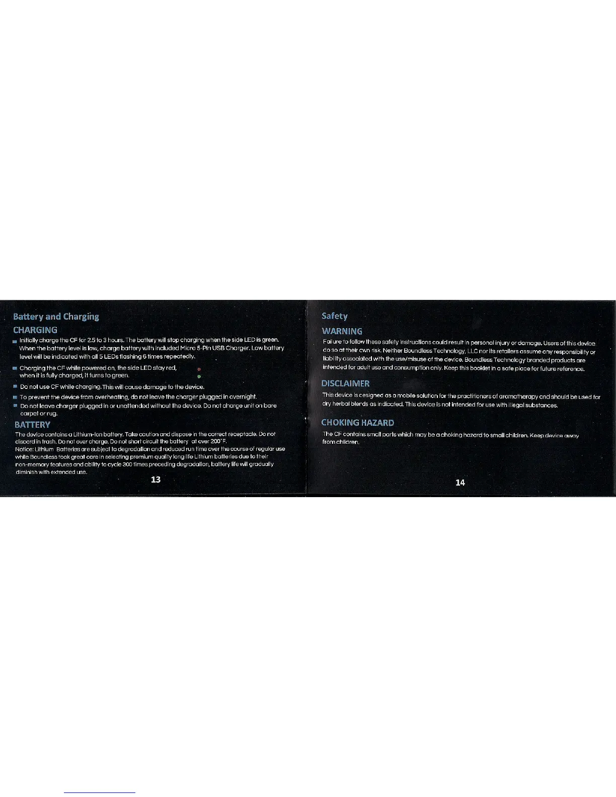 Boundless CF VAPE - Safety, Battery, and Charging; Battery and Charging Information; General Safety Warnings