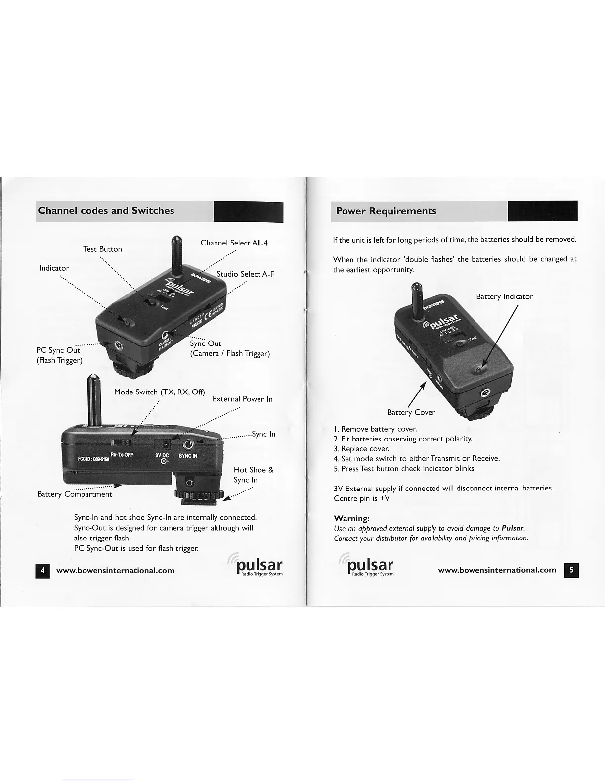 Bowens Pulsar - Channel Codes and Switches; Power Requirements; Battery Installation