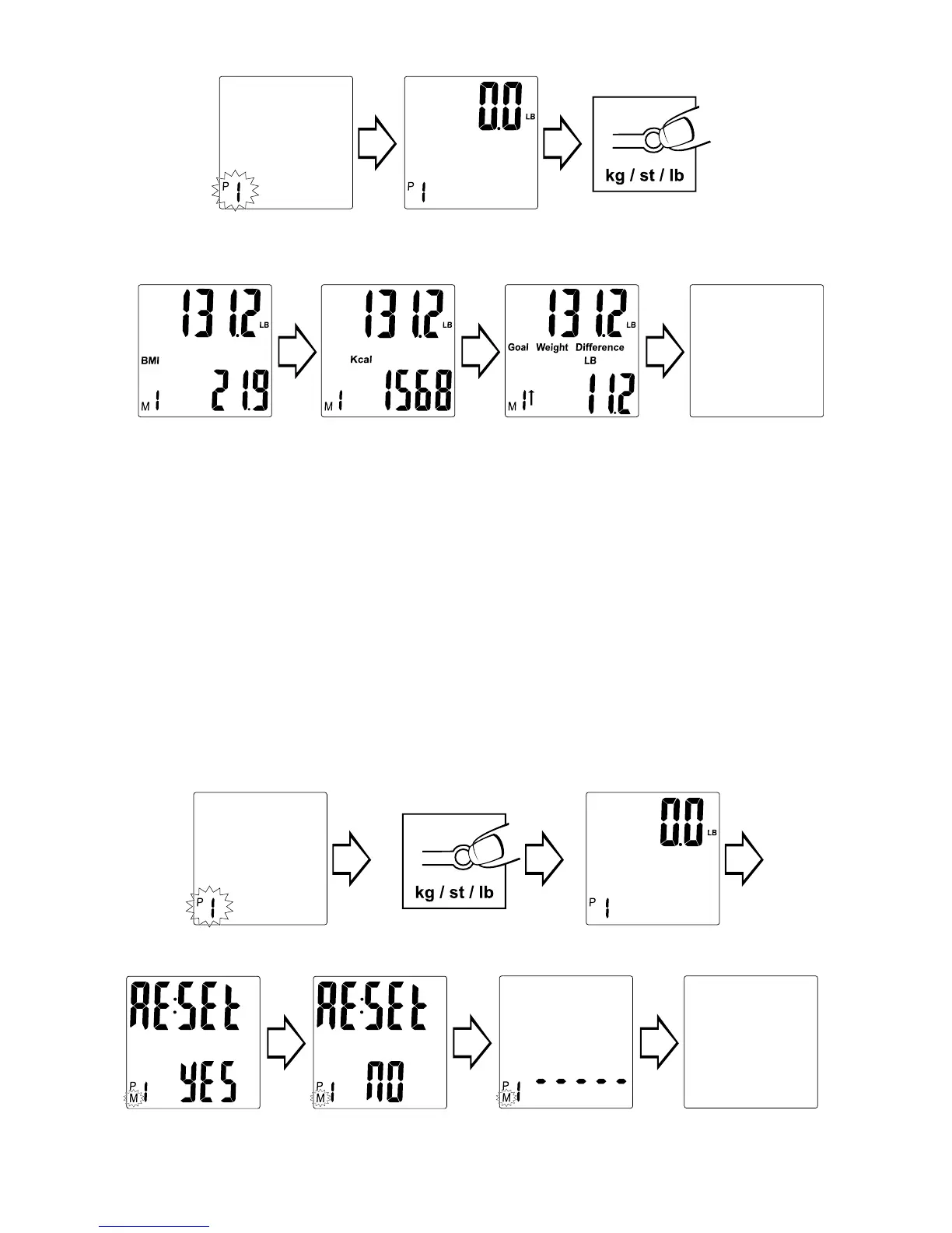 3. When zeros appears, press and hold the “kg/st/lb” button on the bottom