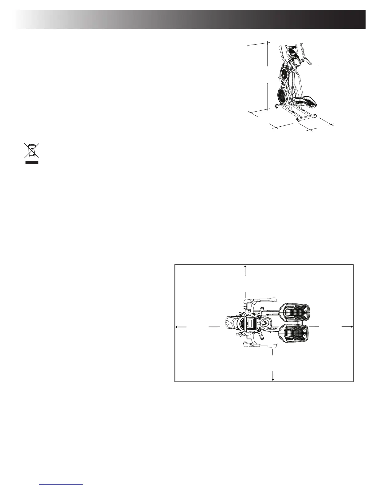 a workout area of a minimum 199.4 cm (78.5”) x 246.4 cm (97”). Be sure that the workout space you are utilizing has adequate height clearance,