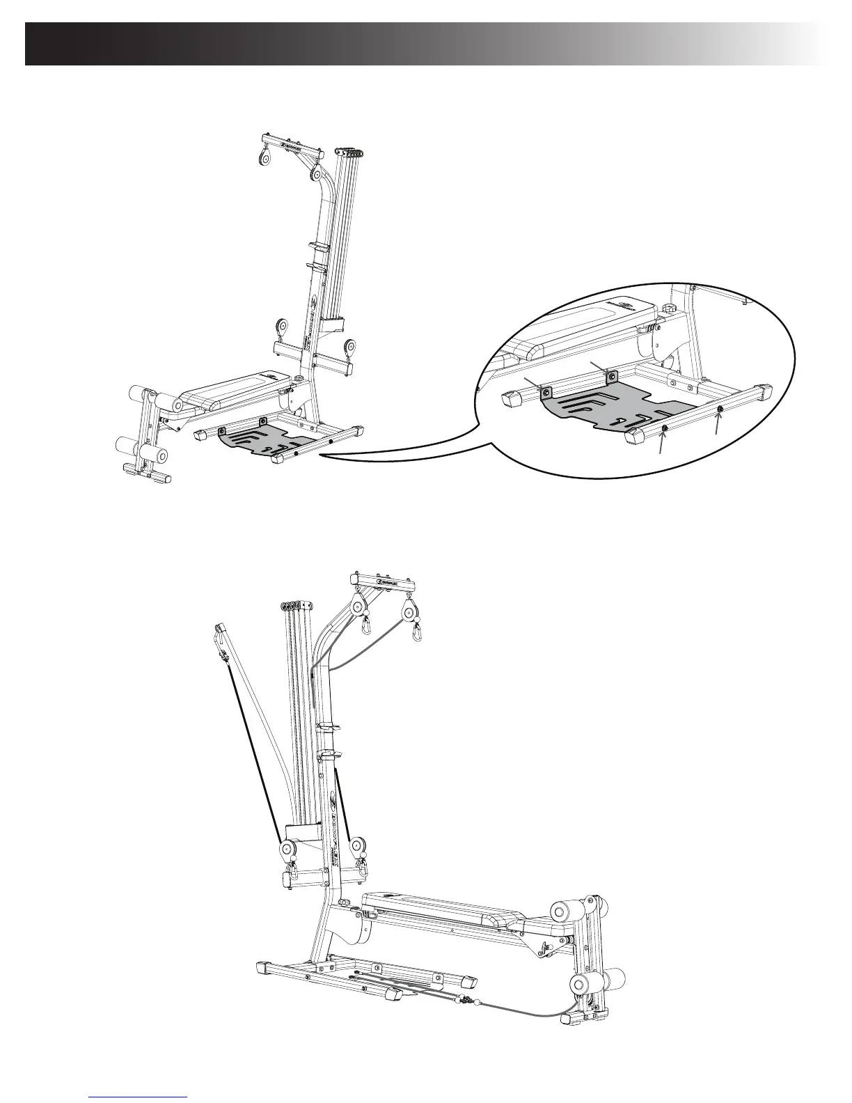 Loosen but do not remove the indicated bolts on the foot plate. Stand on the foot plate until it rests fl at on the fl oor. Re-