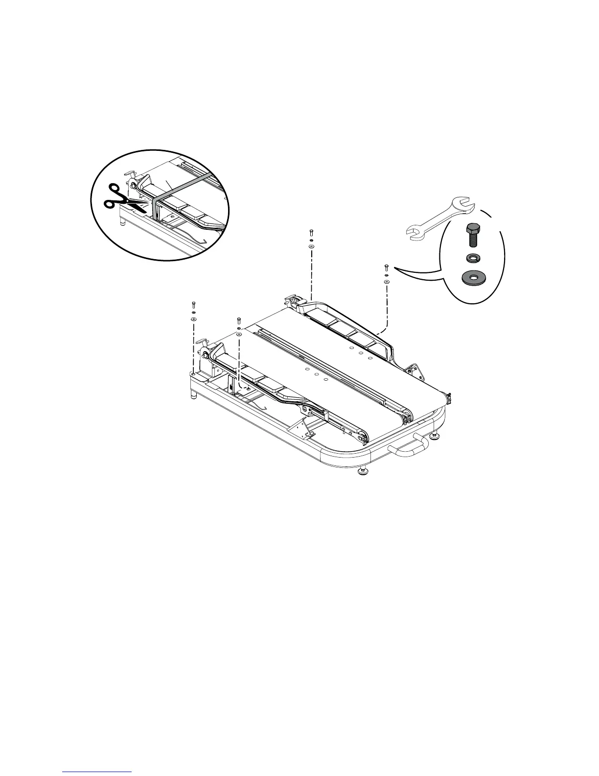 3. Cut and Remove the Shipping Strap (*) and then Secure the Treadle Assembly to the Base Assembly