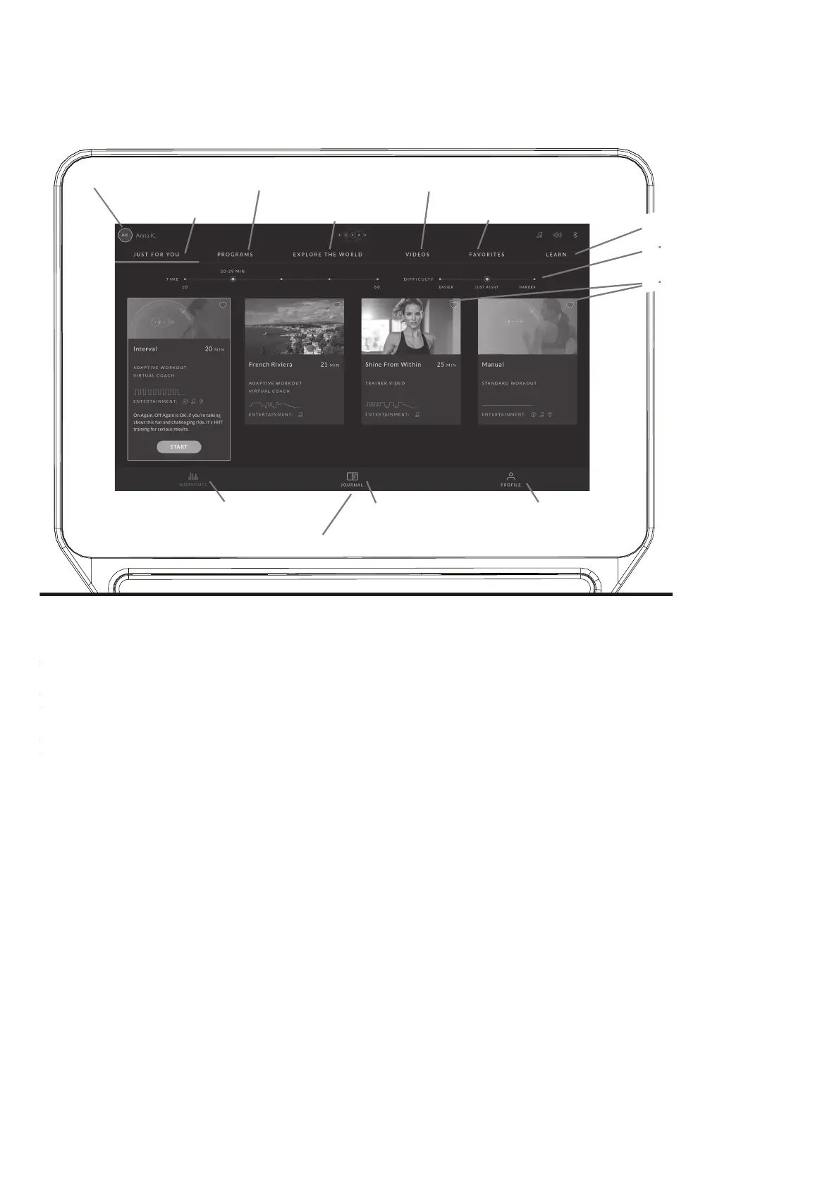 workouts adapted to your capabilities, conveniently displayed on your console, and friendly virtual voice coaching designed to support you on your