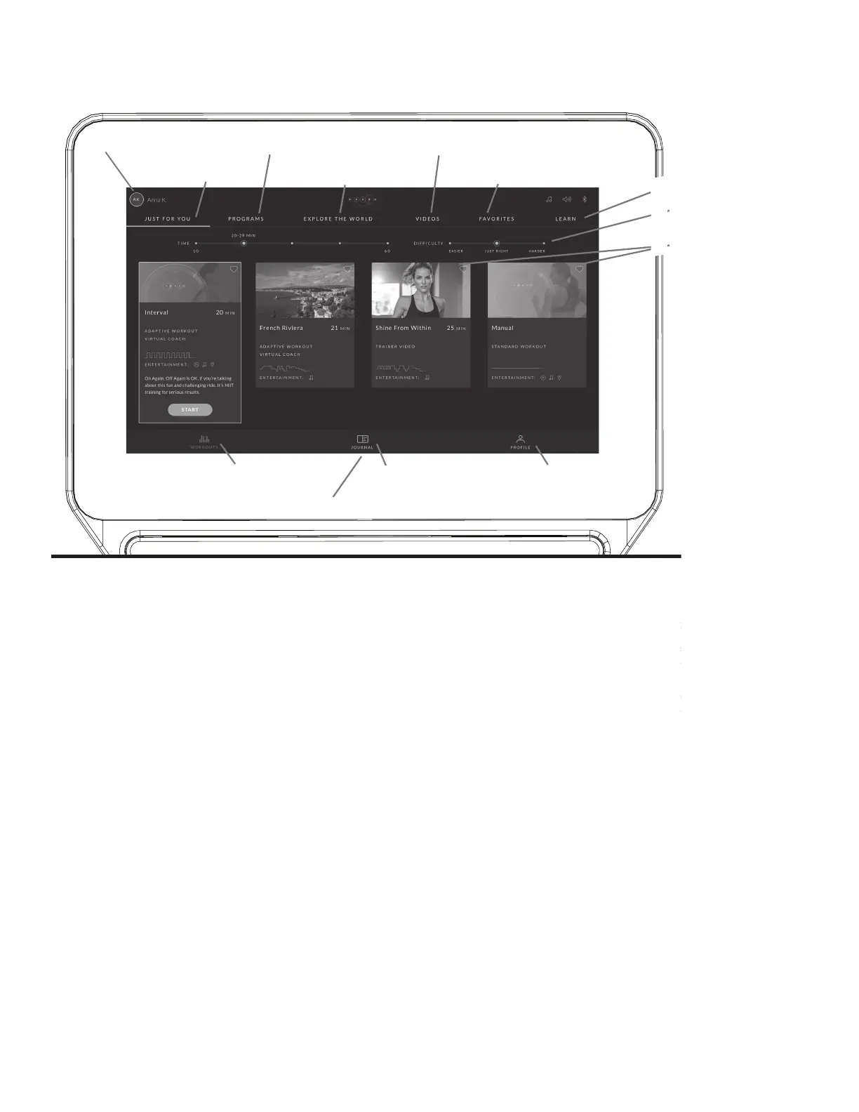 After logging in, the Just For You tab is the starting, or home screen for your machine. Guided adaptive workout options* and educational videos are