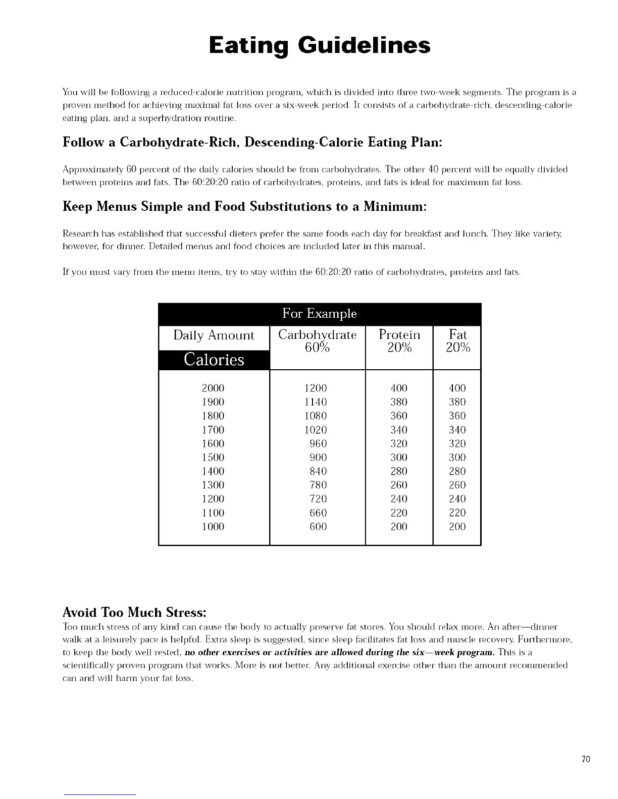 proven method fi_r achieving maximal fat loss over a six-week period. It consists of a carbohydrate-rich, descending-calorie