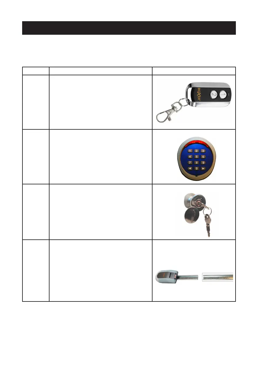 annet fjernkontroll, kodetastatur for utvendig montering, nødåpner, batteri til