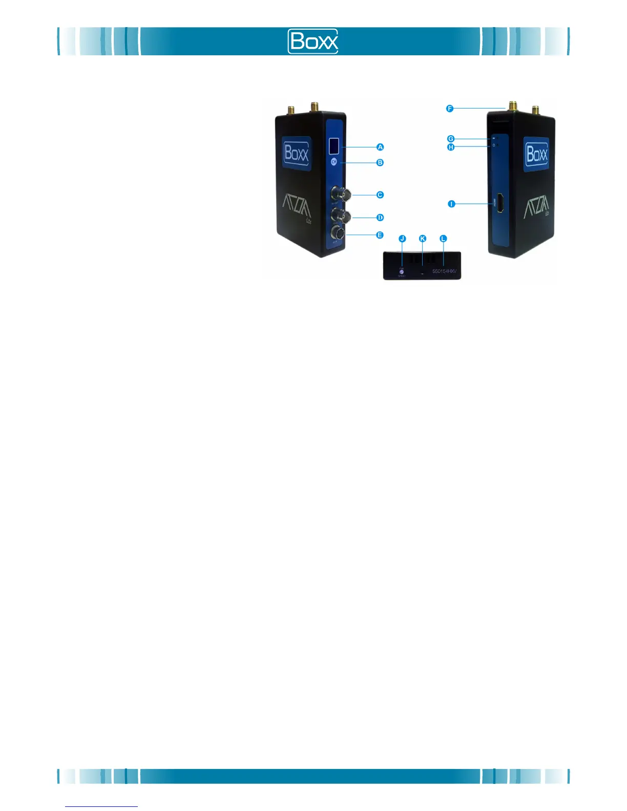 The Boxx Atom Transmitter is equiped with a 3G HD-SDI Video/Audio Output socket (Fig 1-C) to be used for