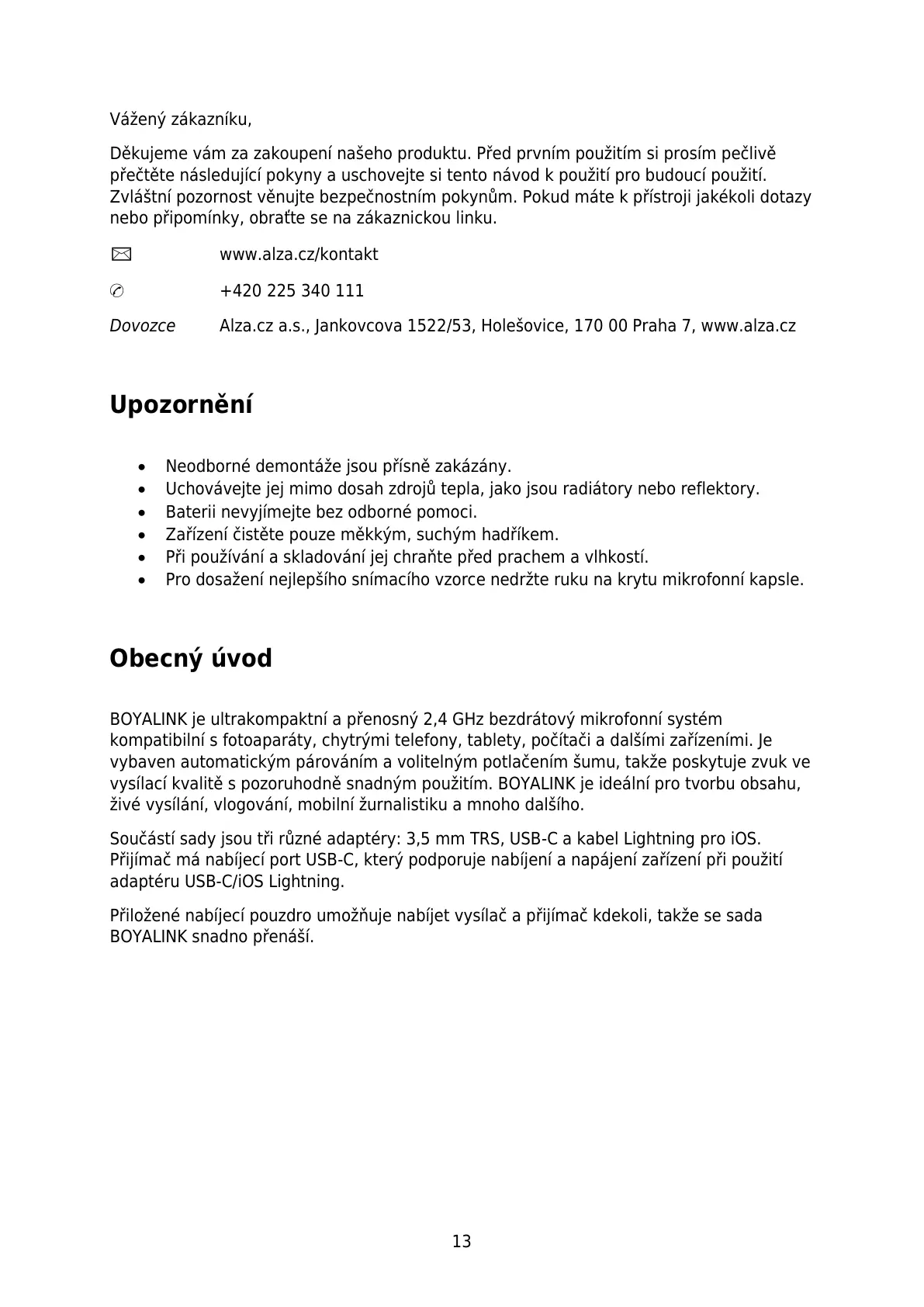 Dovozce Alza.cz a.s., Jankovcova 1522/53, Holešovice, 170 00 Praha 7, www.alza.cz