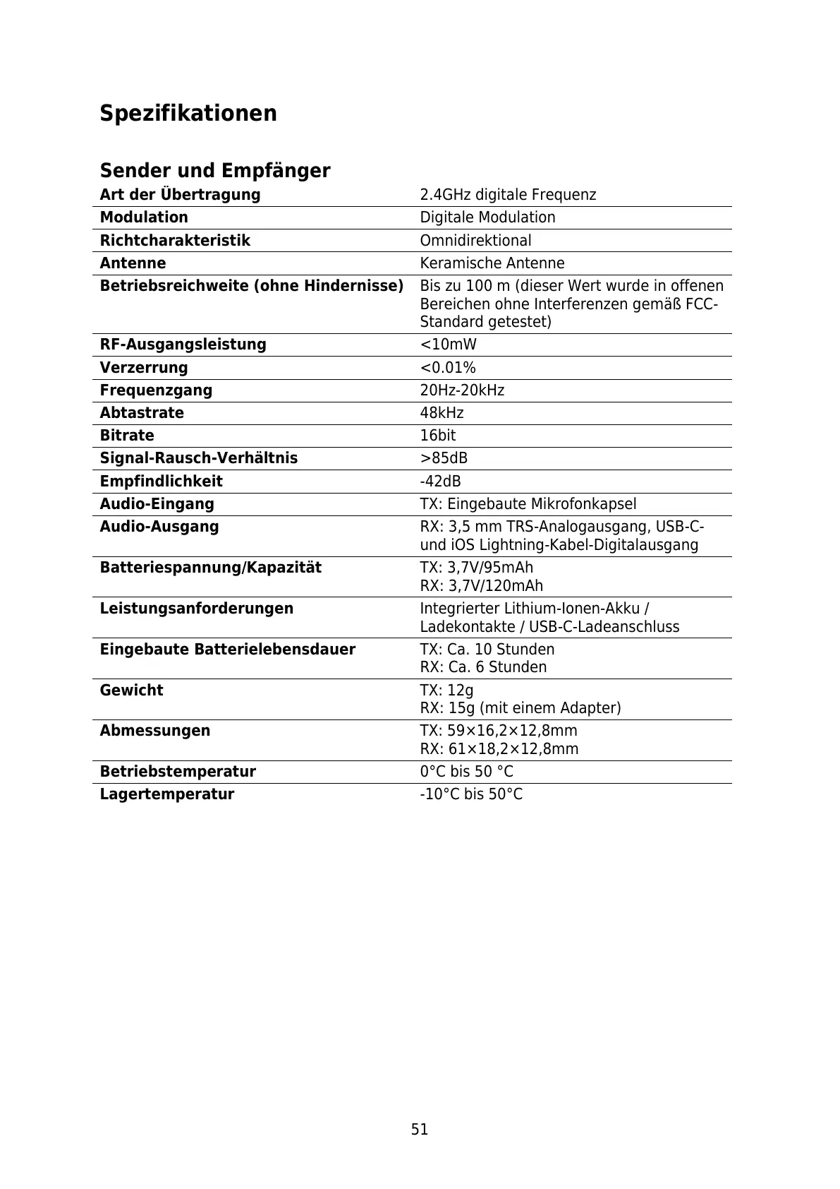 Boya BOYALINK - Spezifikationen; Sender und Empfänger