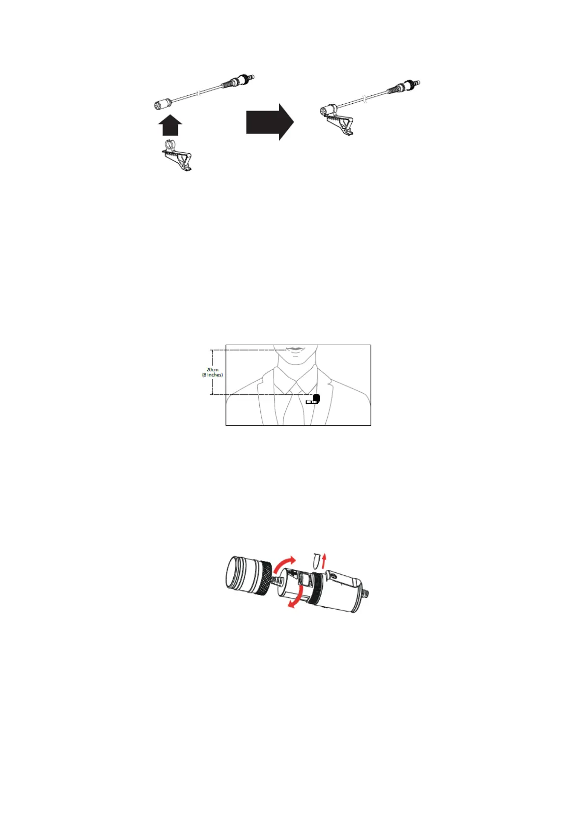 Rögzítse a mikrofont a ruházatához a ruhacsíptetővel, kb. 20-25cm-re az arcától.