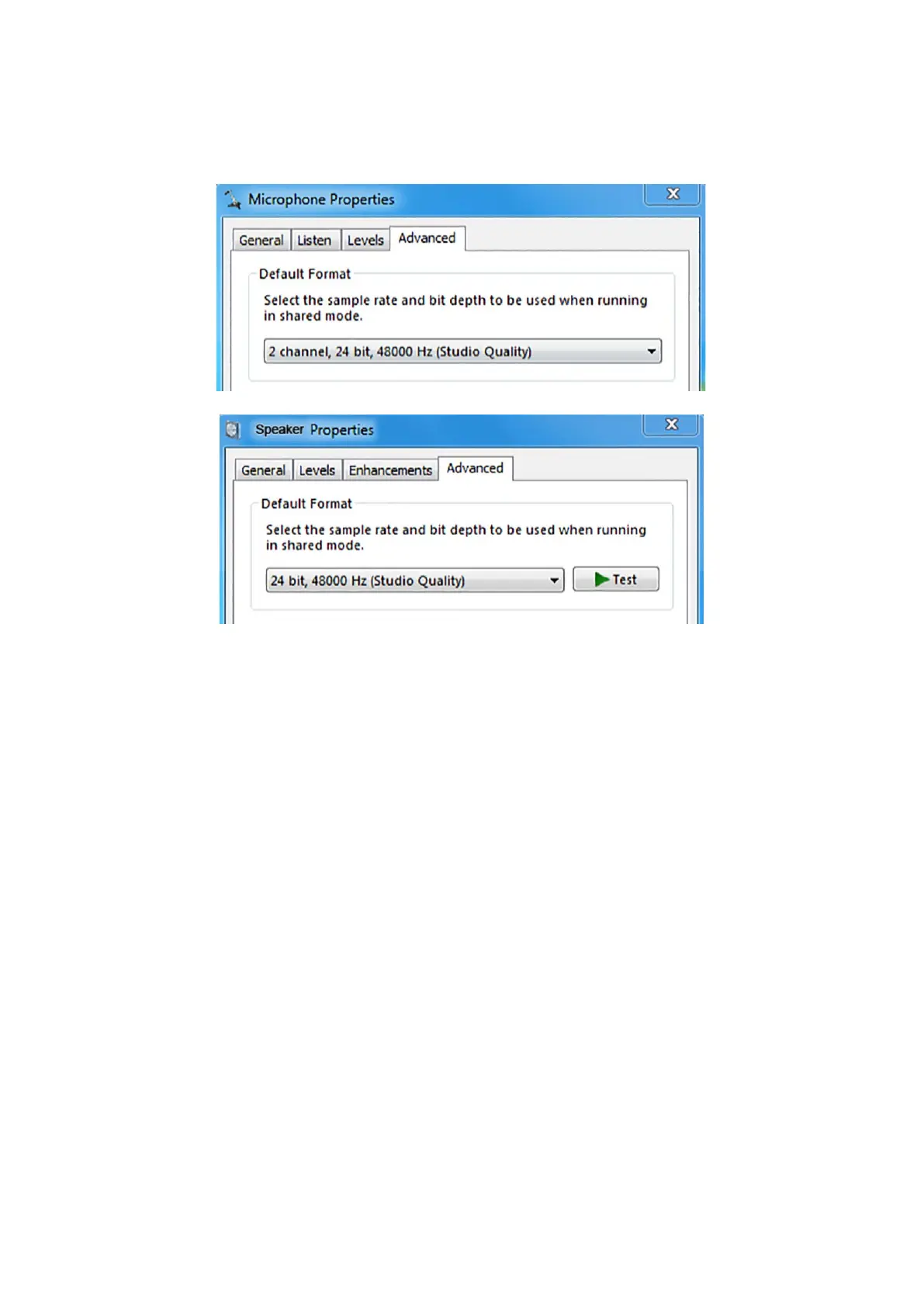 Please make sure to set up both of microphone and speaker to "24 bit, 48000 Hz (Studio Quality)"