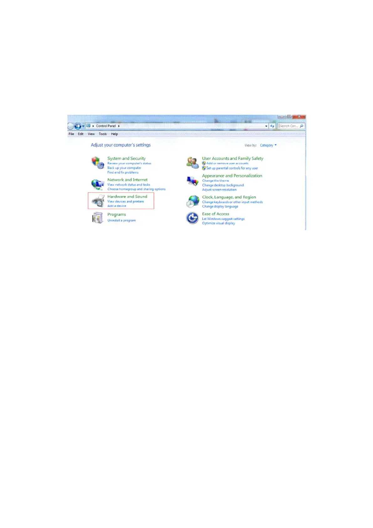 3. Přejděte na „Ovládací panel“ a vyberte „Hardware a zvuk“.