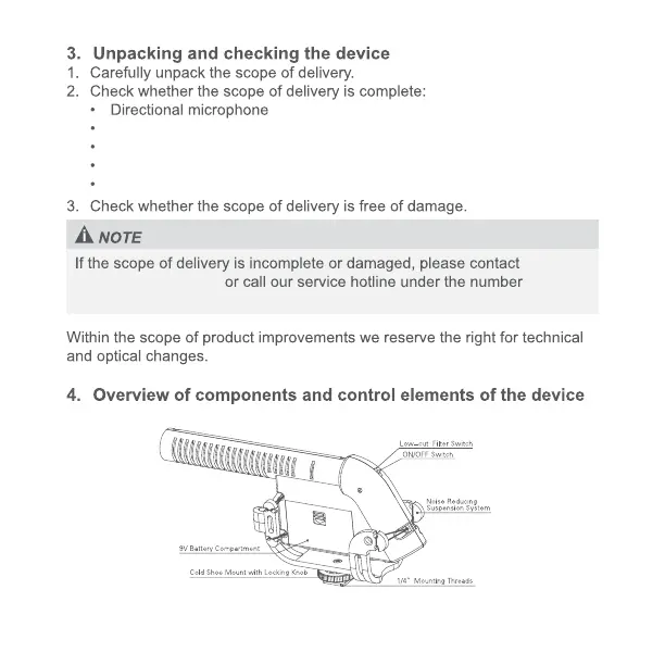 Boya BY-VM190 - Unpacking and checking the device; Overview of components and control elements of the device